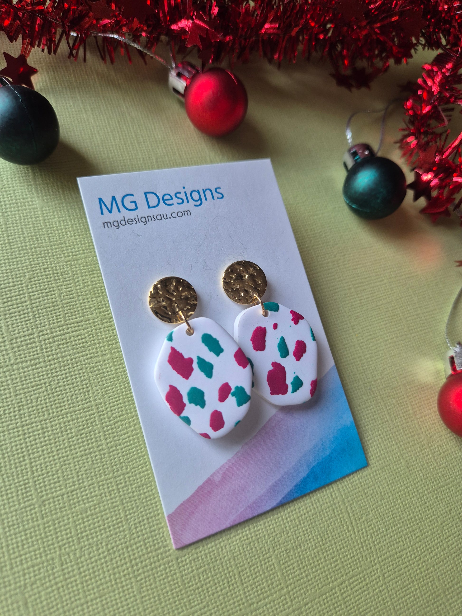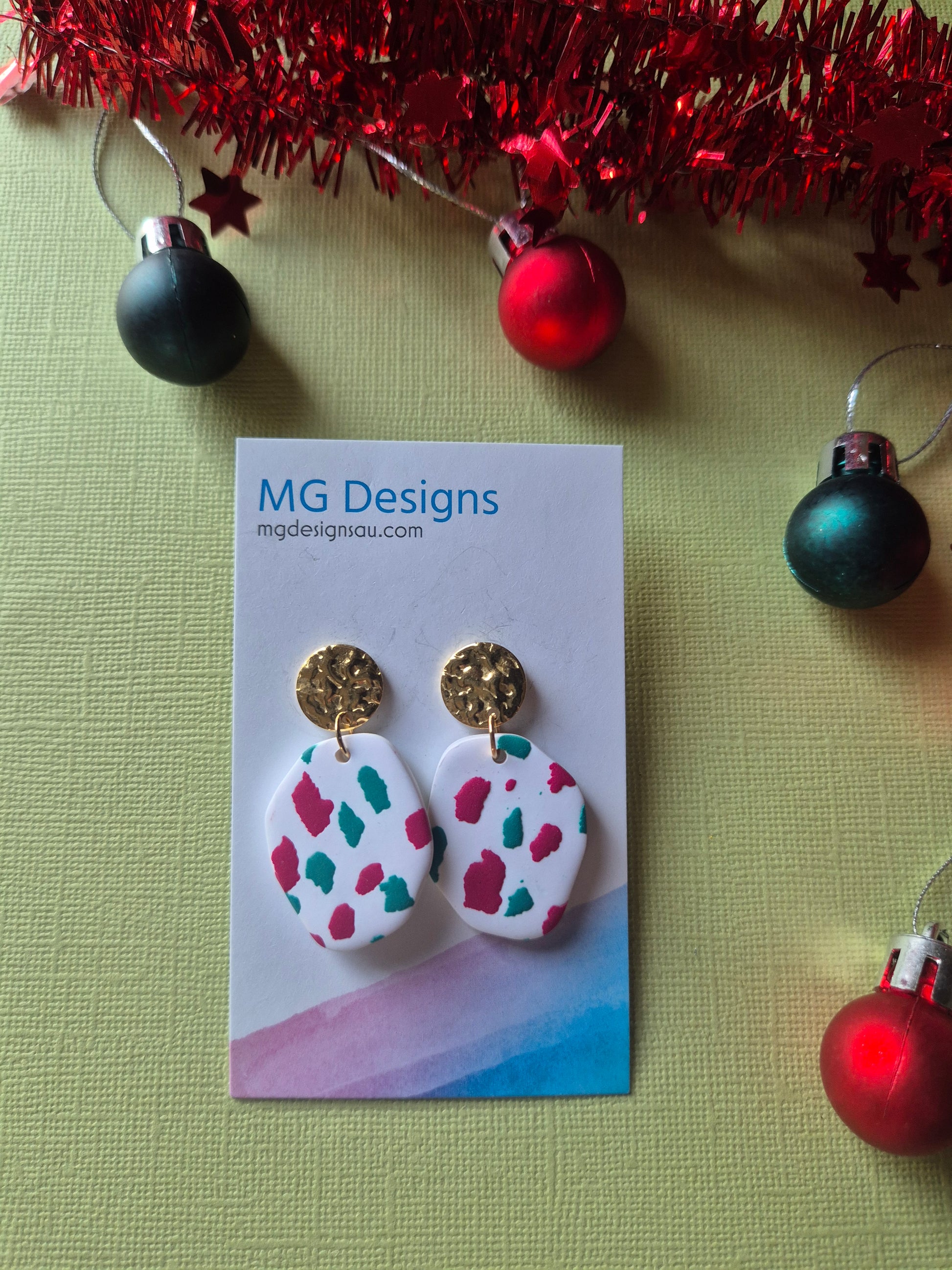 Add a touch of elegance to your holiday look with these festive earrings, featuring an organic shape in a bold white, red and green color palette. With a gold textured stud top that adds a luxurious touch, perfect for any occasion. Elevate your style and embrace the holiday spirit with these stunning earrings.