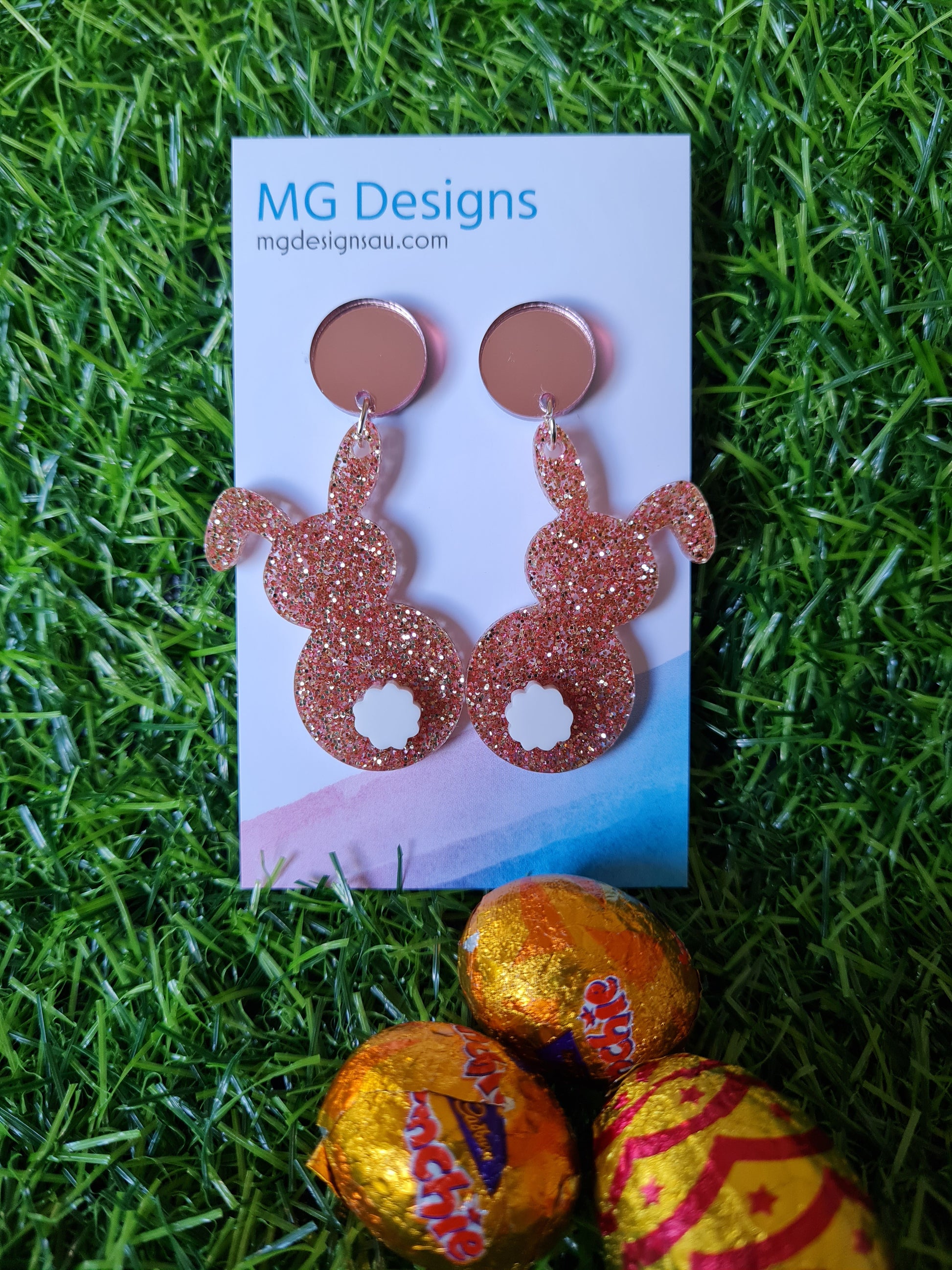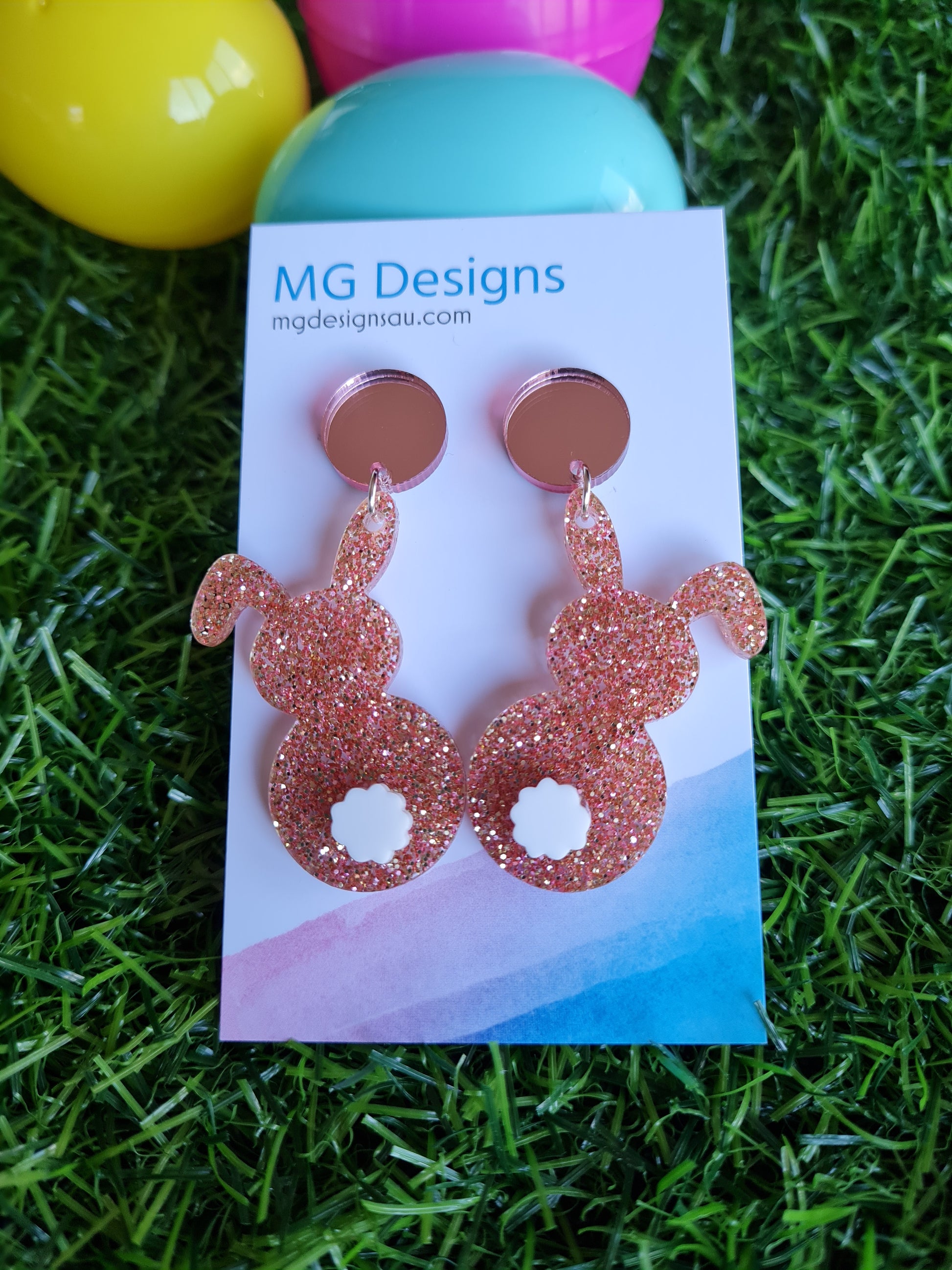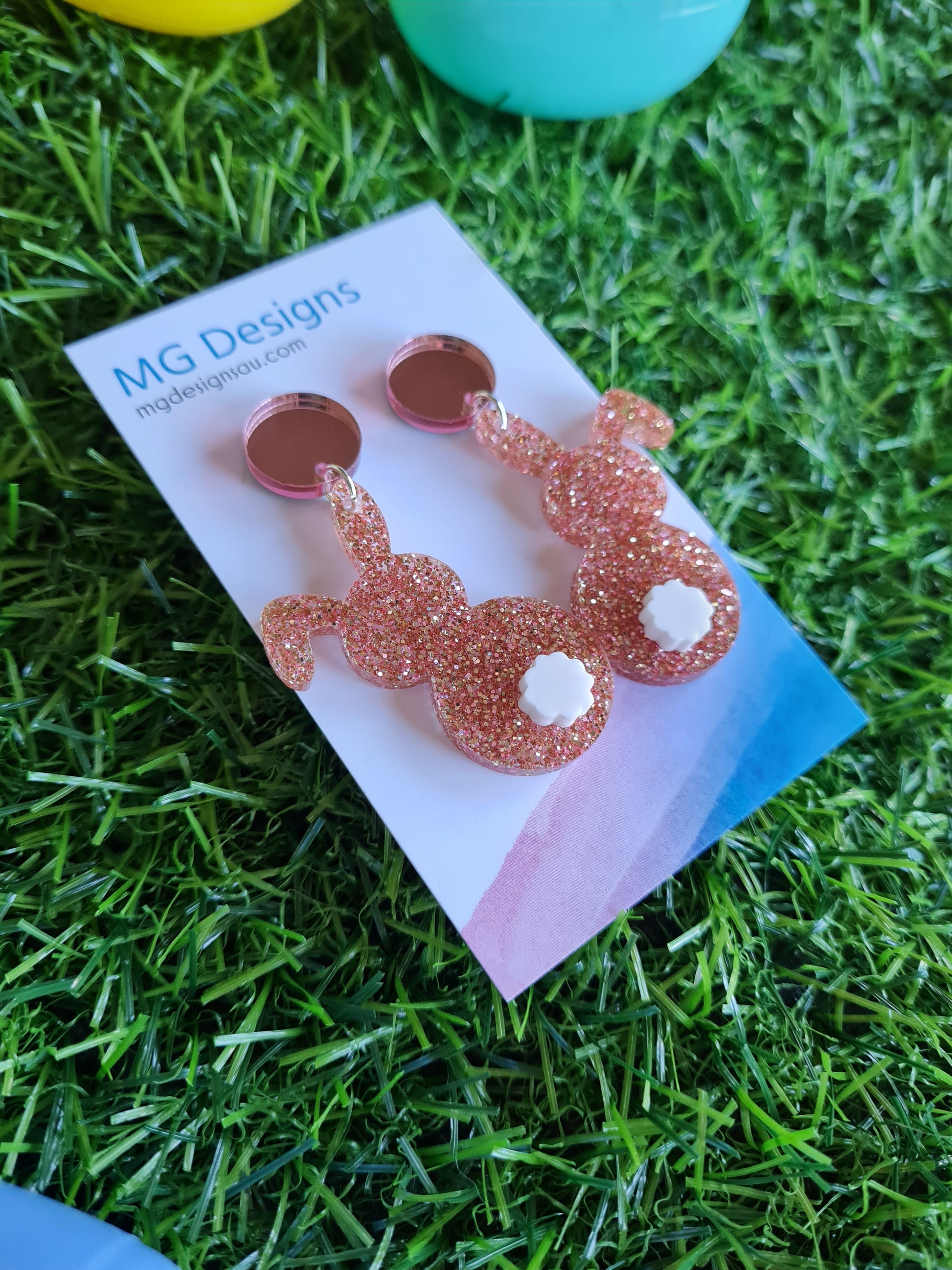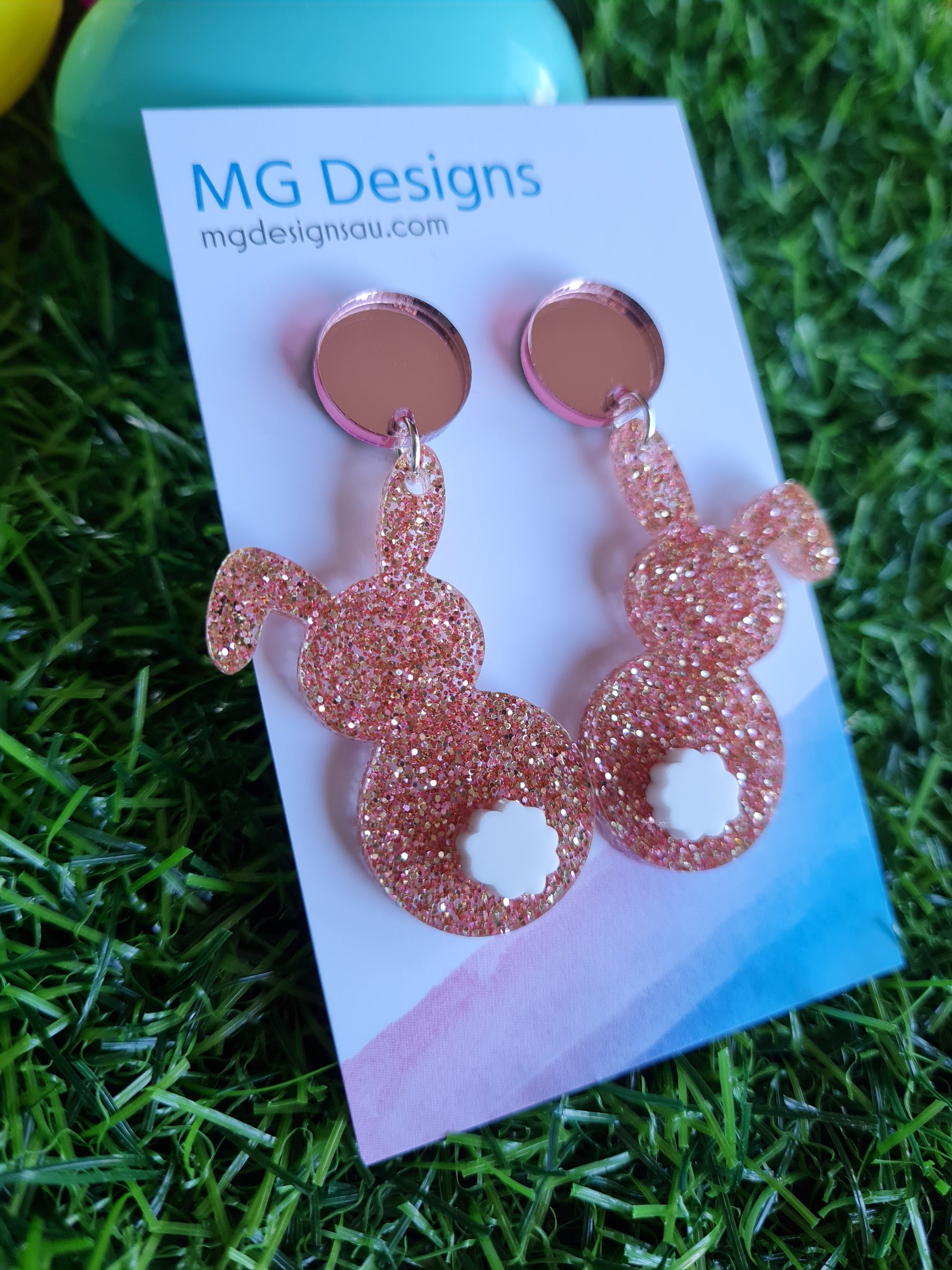 Pink glitter body component, rosegold mirror round component with adorable white tail. Joined with a silver jump ring.
