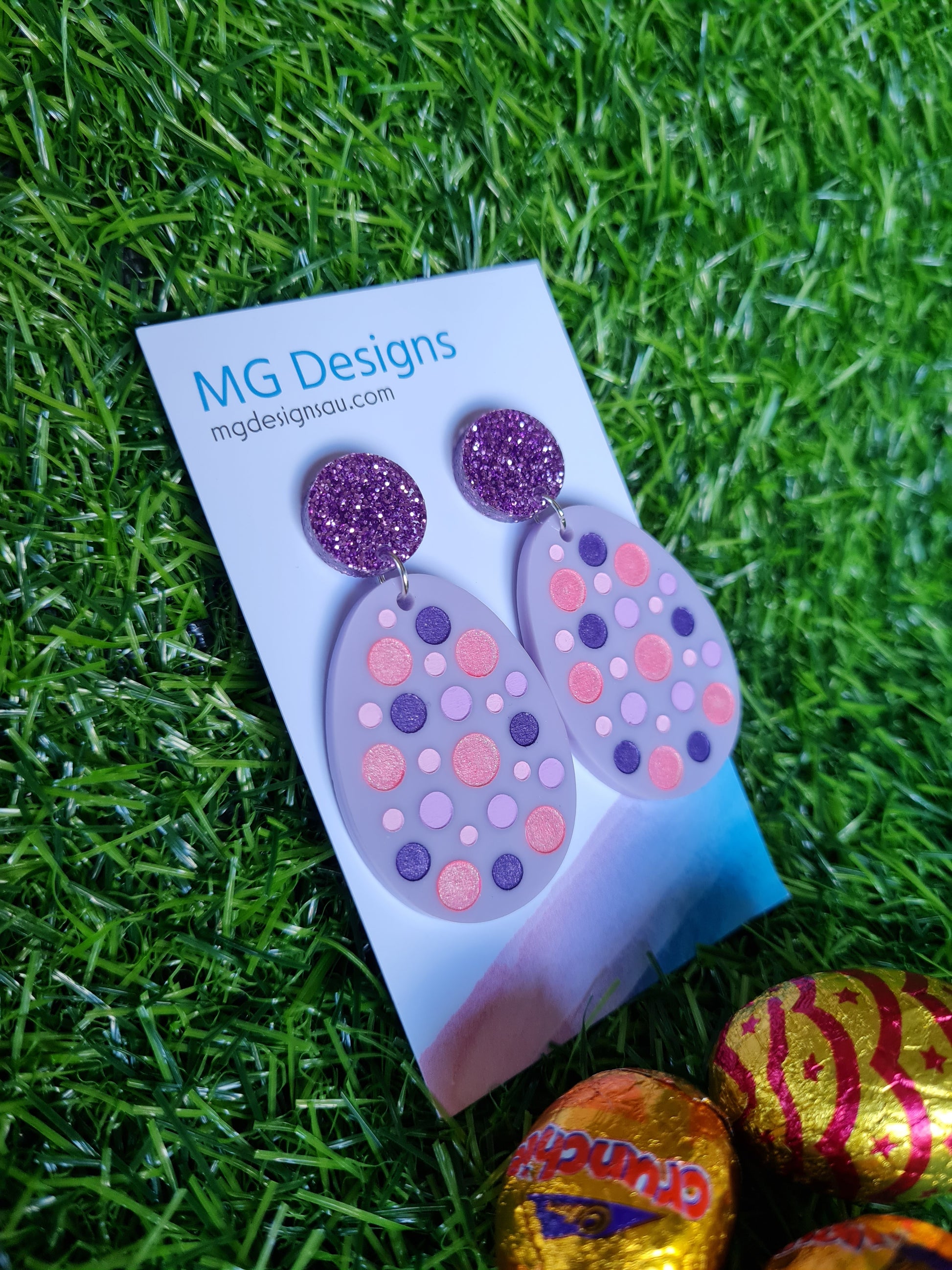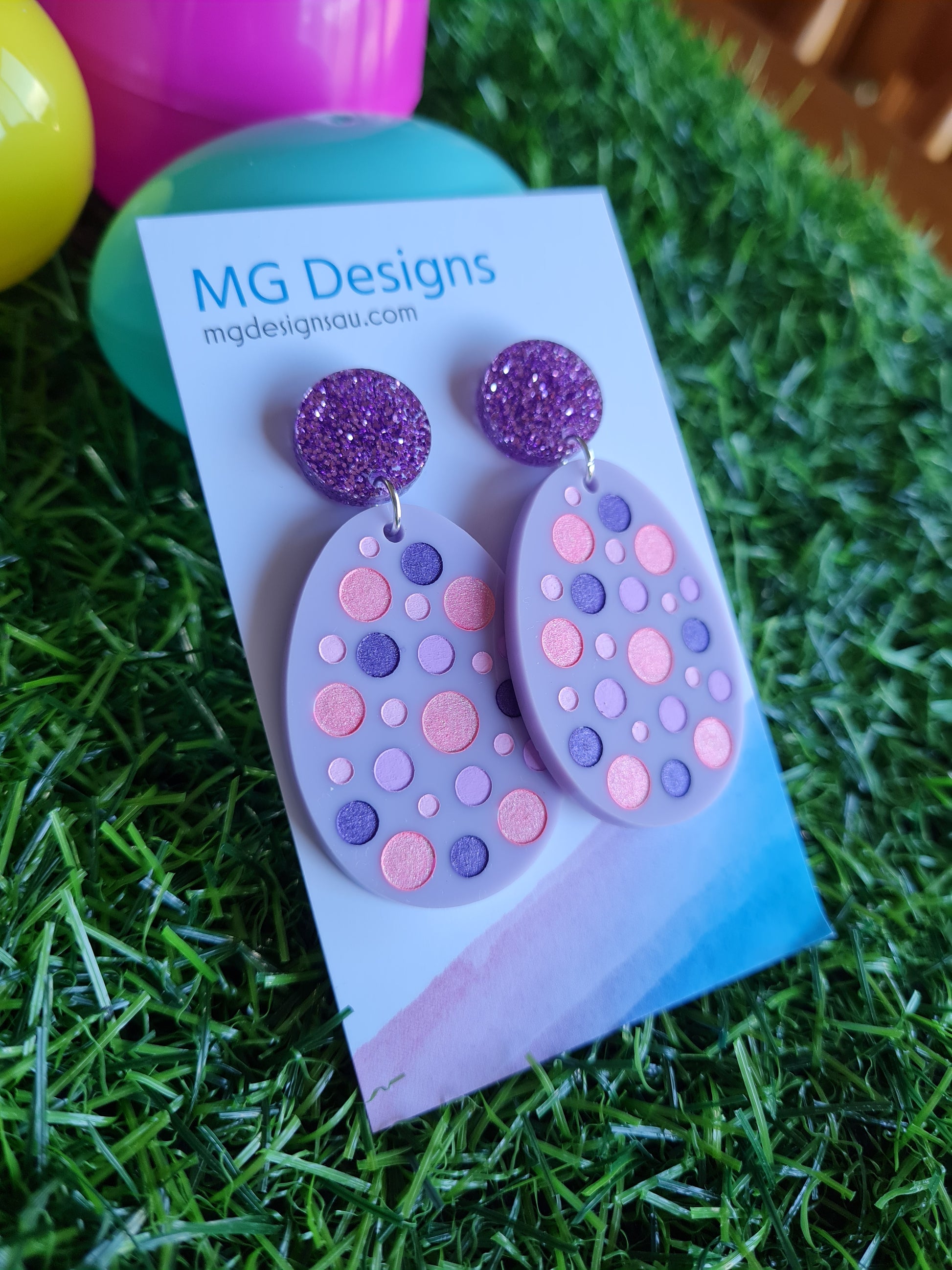 Light Purple body component, purple glitter round component. Joined with a silver jump ring. Inner decorative circles hand coloured using Metallic and pastel colours.