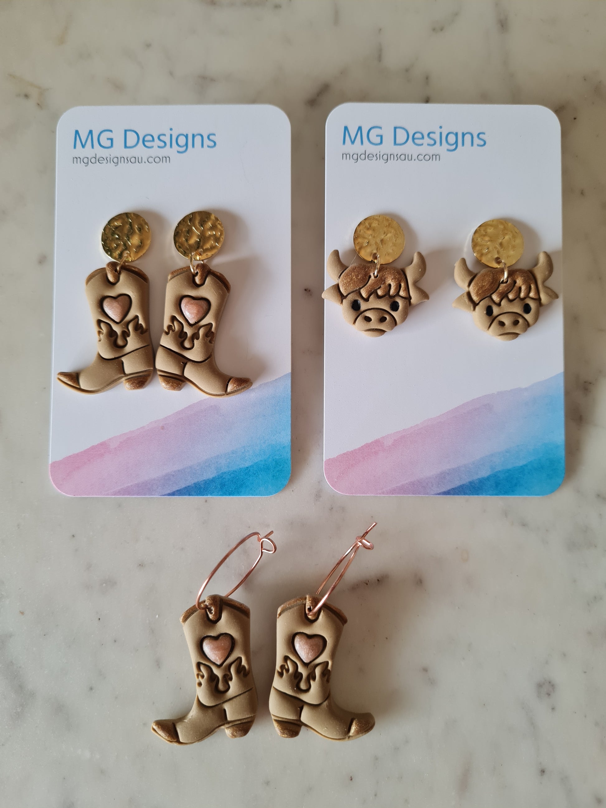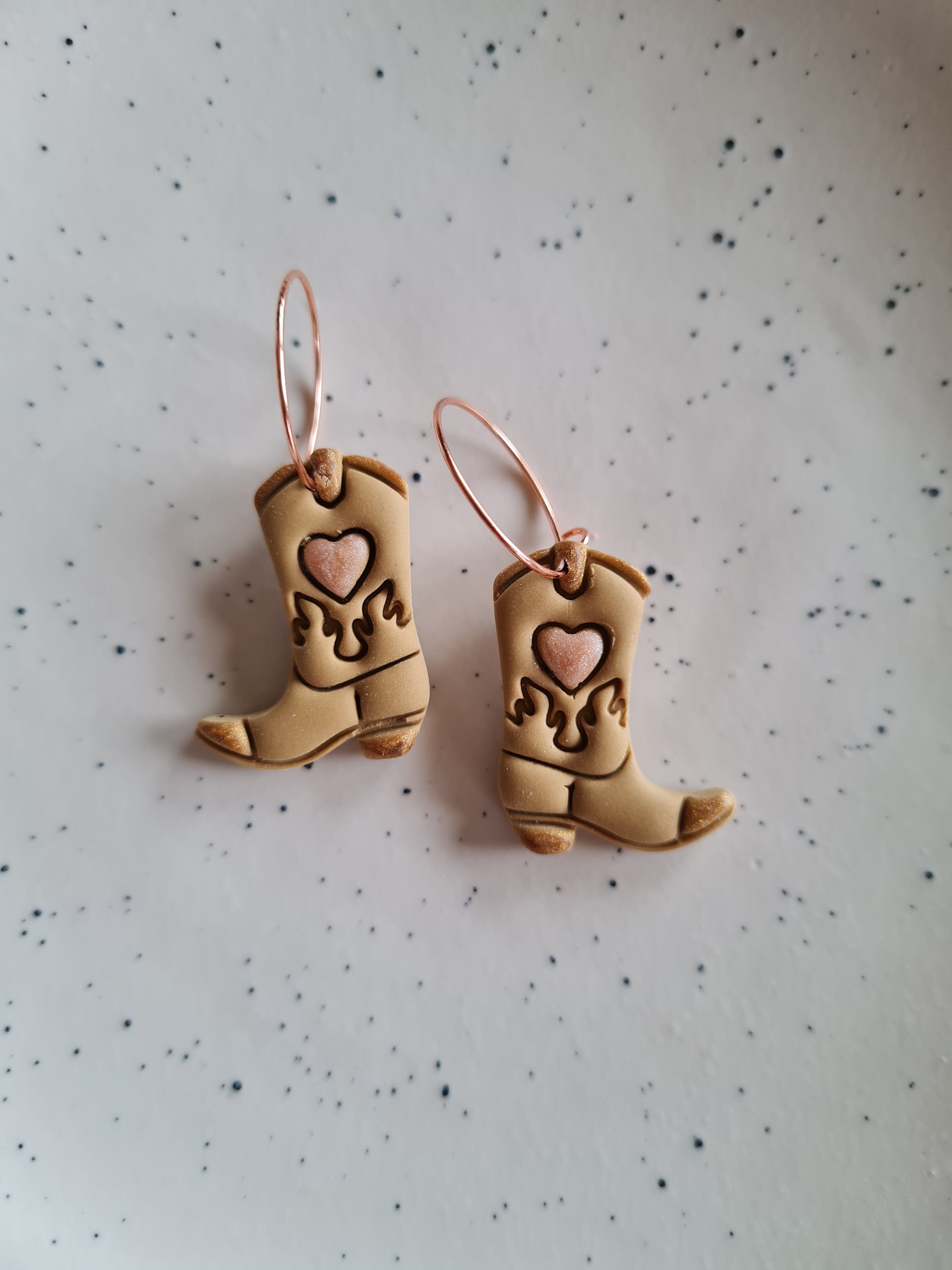 Step into the wild west with our Cow Girl Boot Hoops. These light brown boots are adorned with a shimmering pink heart as the perfect touch of femininity. These earrings are a must-have for any cowgirl or fashionista looking to add a touch of the wild west to their wardrobe.