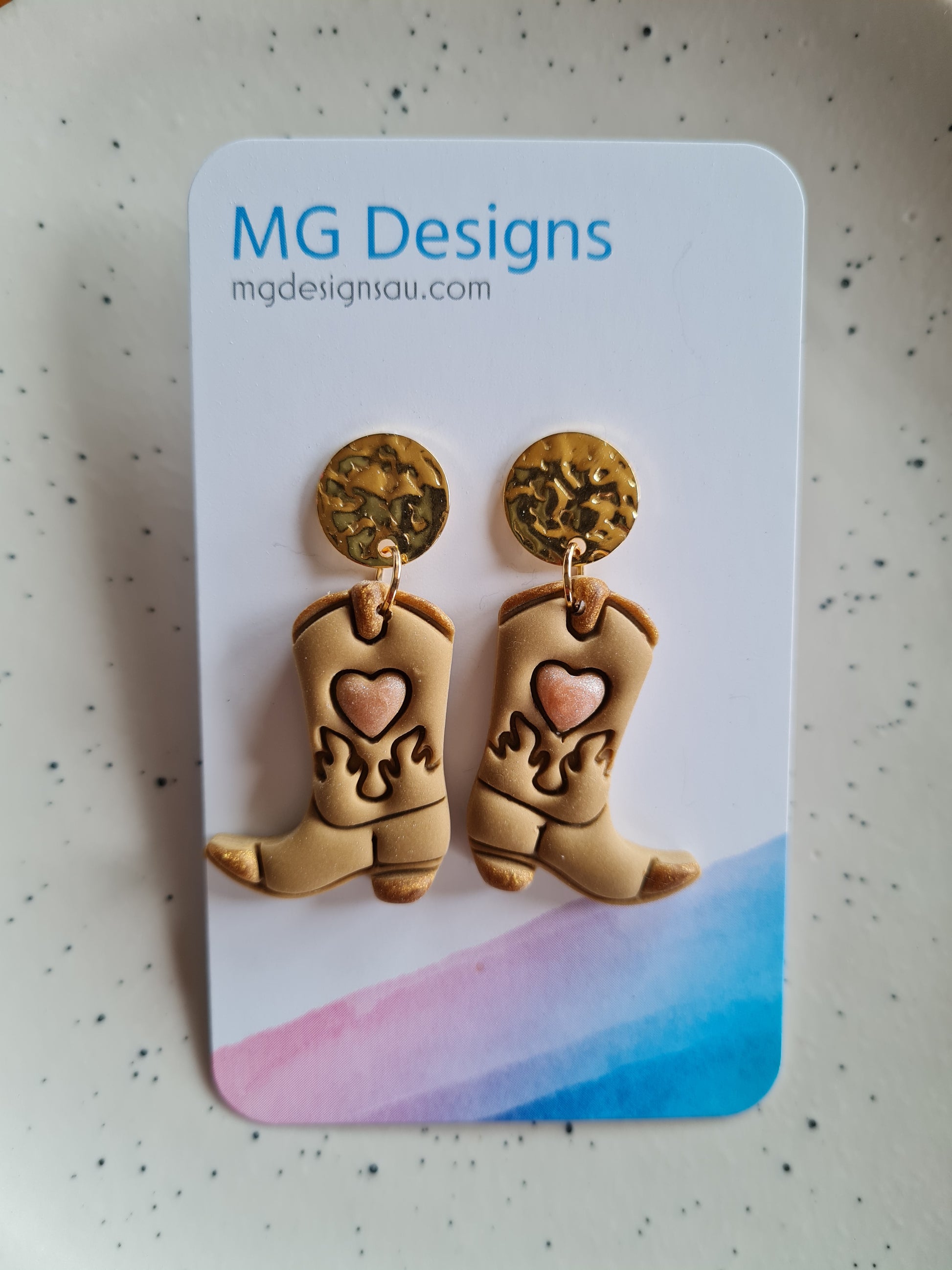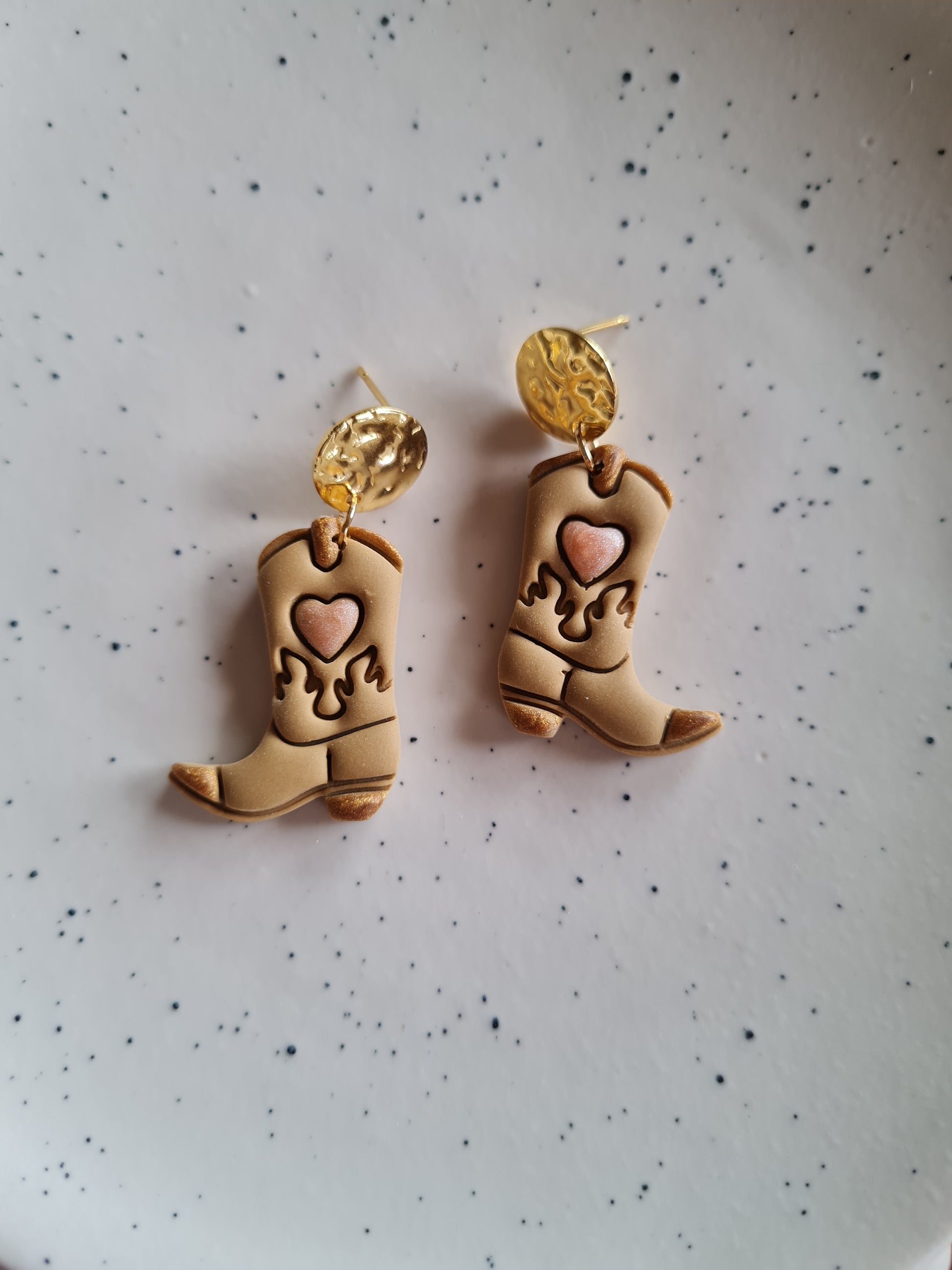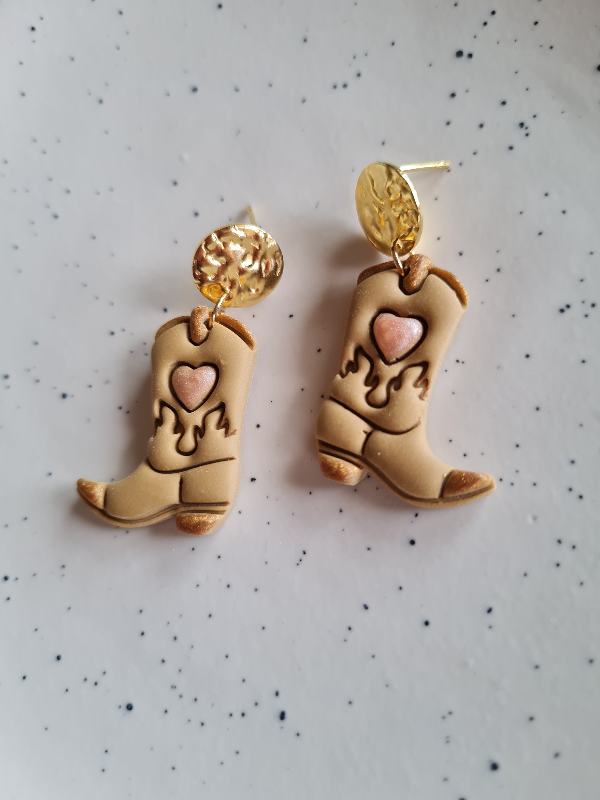 Step into the wild west with our Cow Girl Boots. These light brown boots are adorned with a shimmering pink heart as the perfect touch of femininity. These earrings are a must-have for any cowgirl or fashionista looking to add a touch of the wild west to their wardrobe.