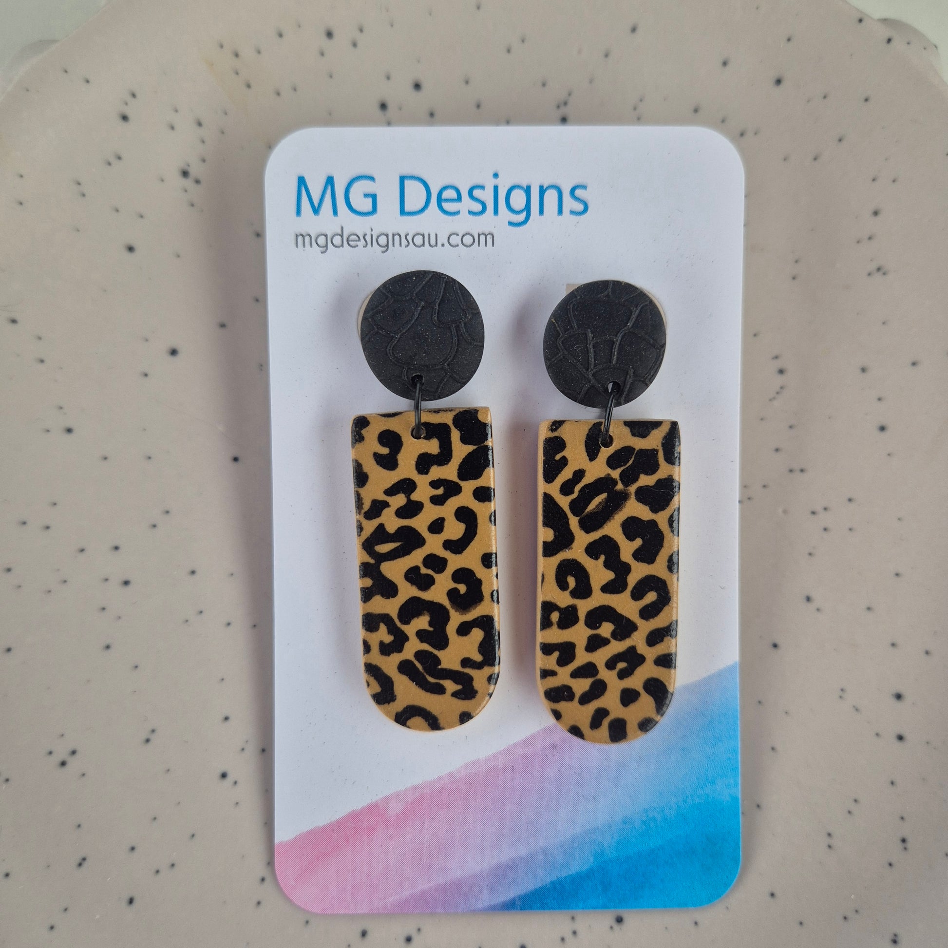Our Alexis earrings, are delightfully unique in each piece. All handmade with silk screens and acylic paint and polymer clay. The black and brown color combinations provide an eye-catching aesthetic, while the lightweight construction provides comfort and convenience. A perfect accessory to make any look pop.