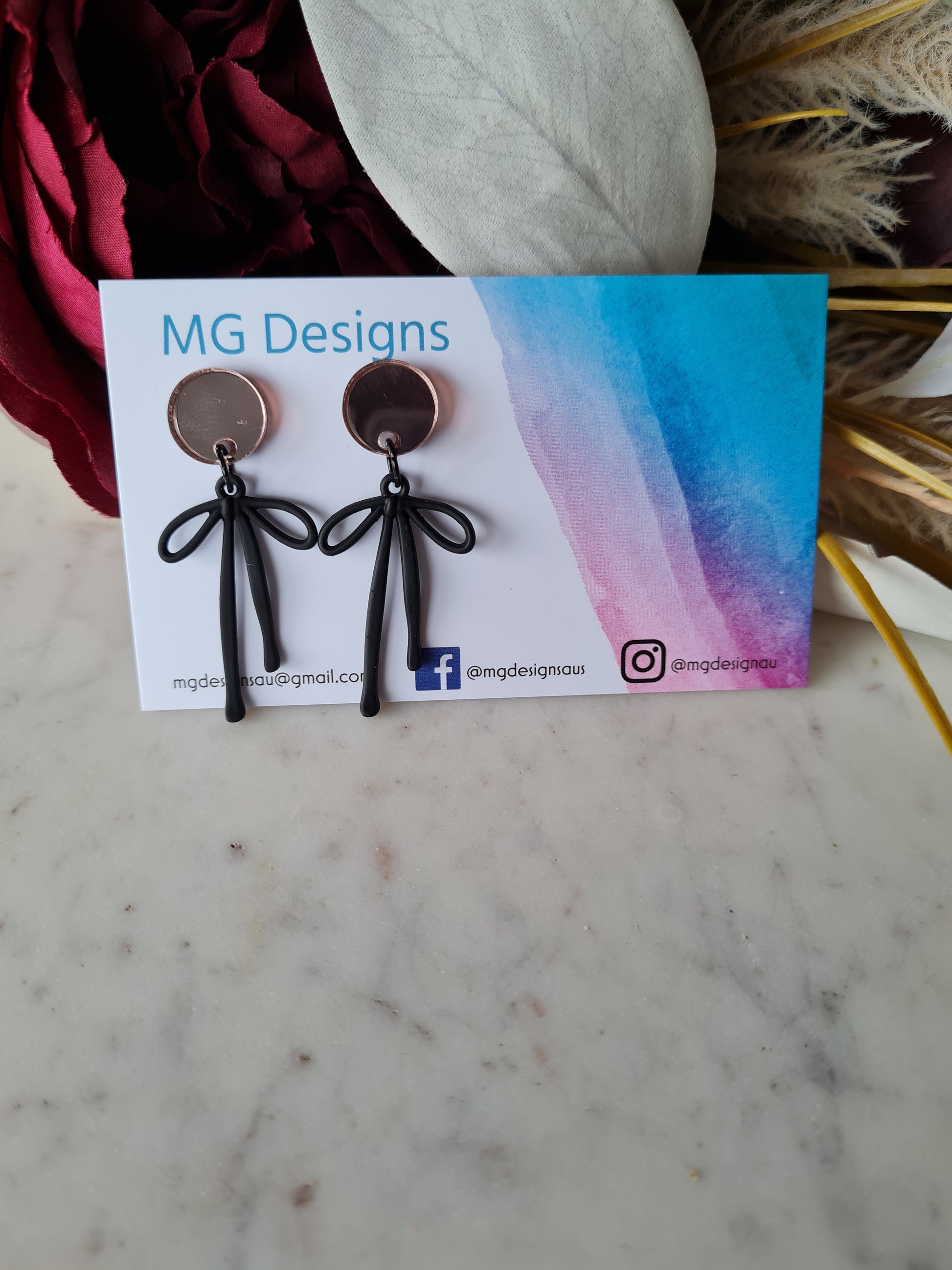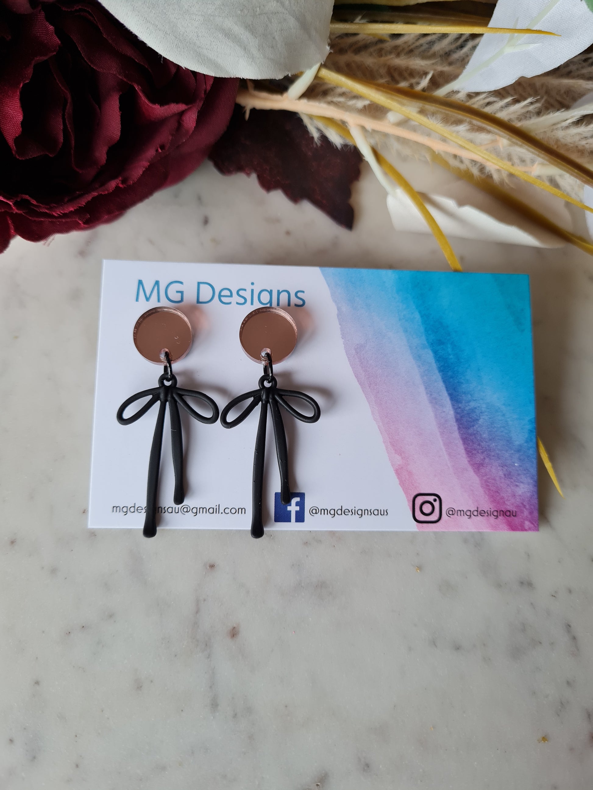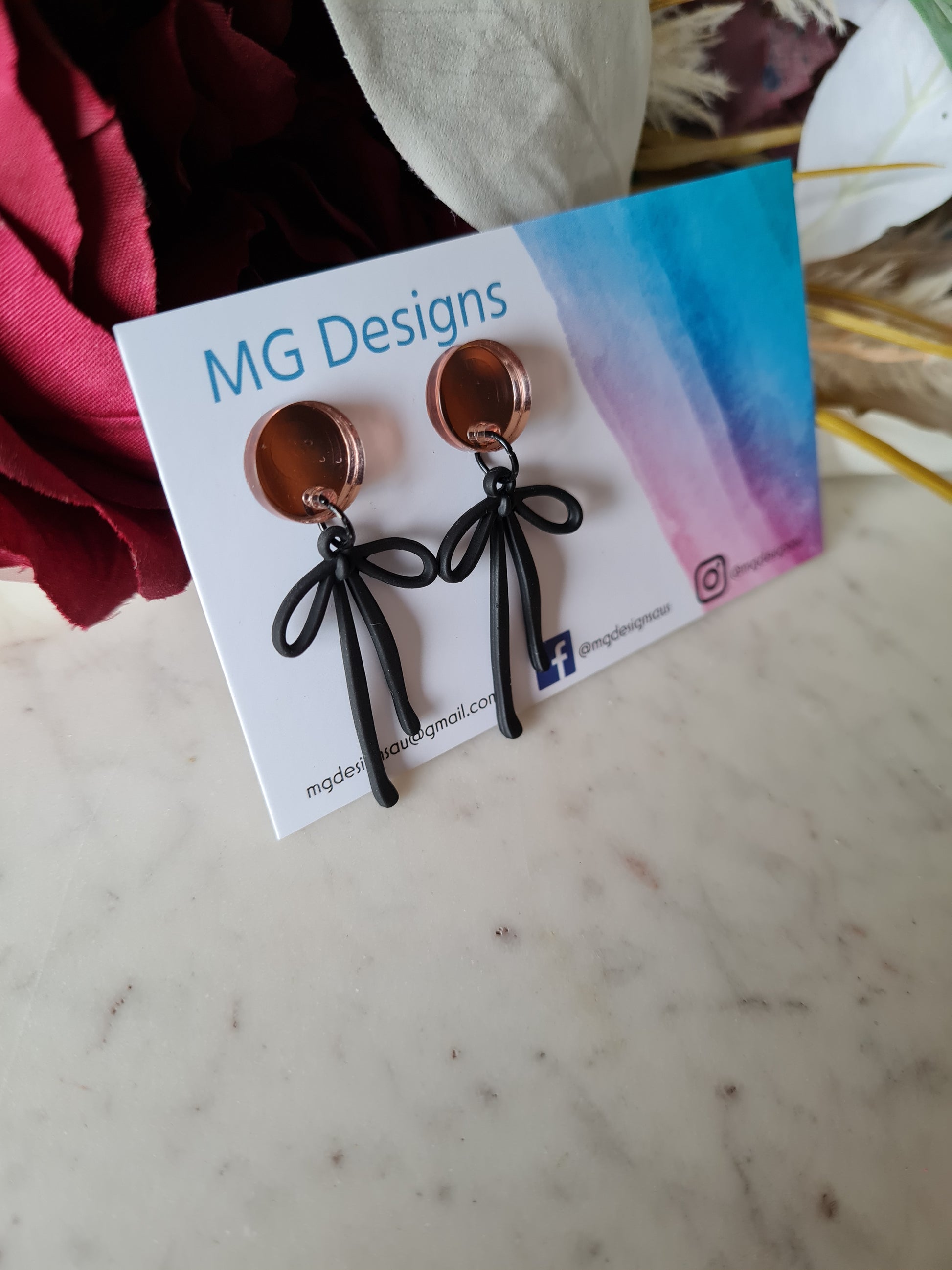 Acrylic top earring, attached to a black coated metal bow component, that is made using quality products. These earrings are light weight and perfect for any occasion. The metal earring post is made from hypo-allergenic surgical steel for sensitive ears.