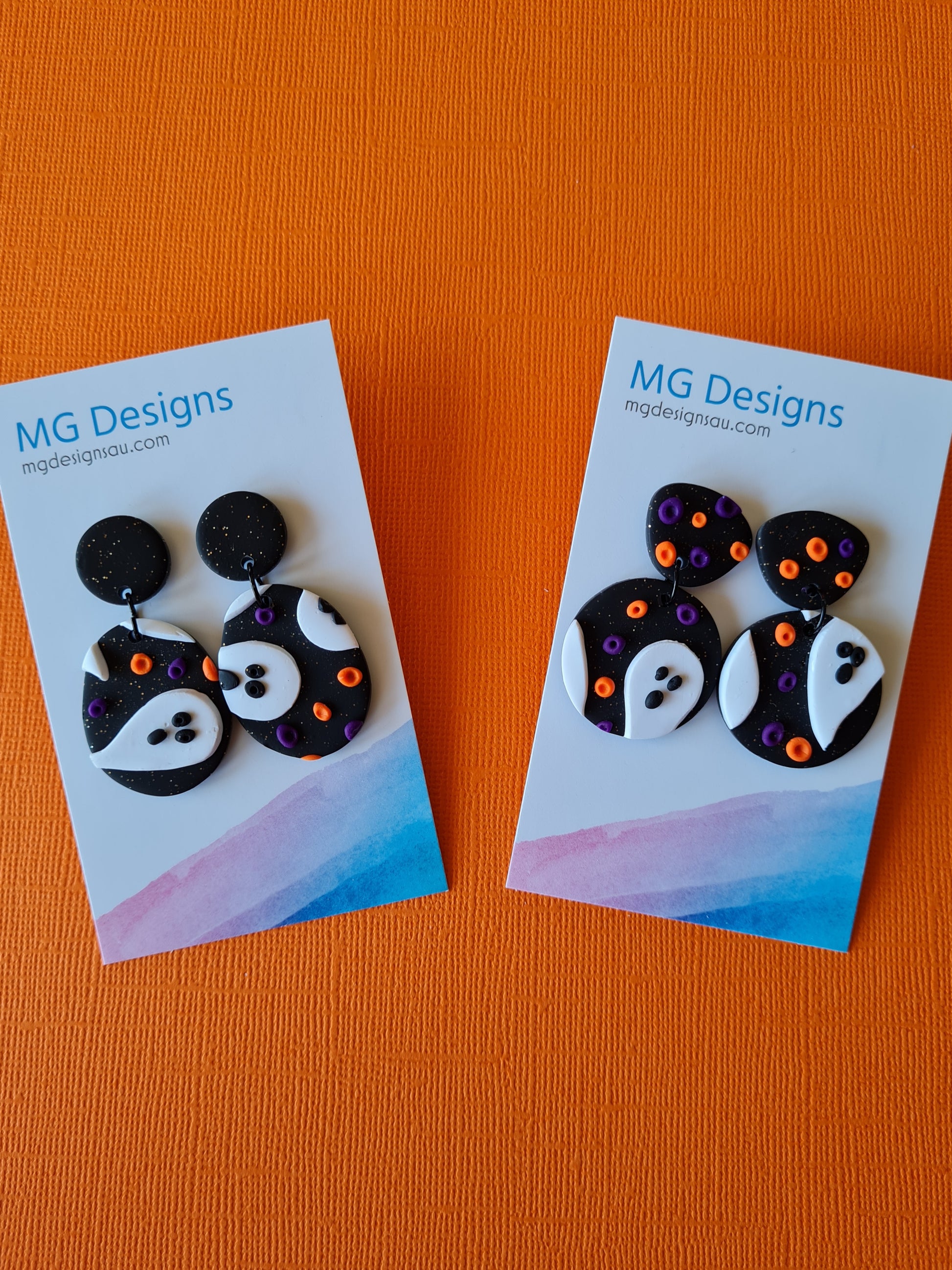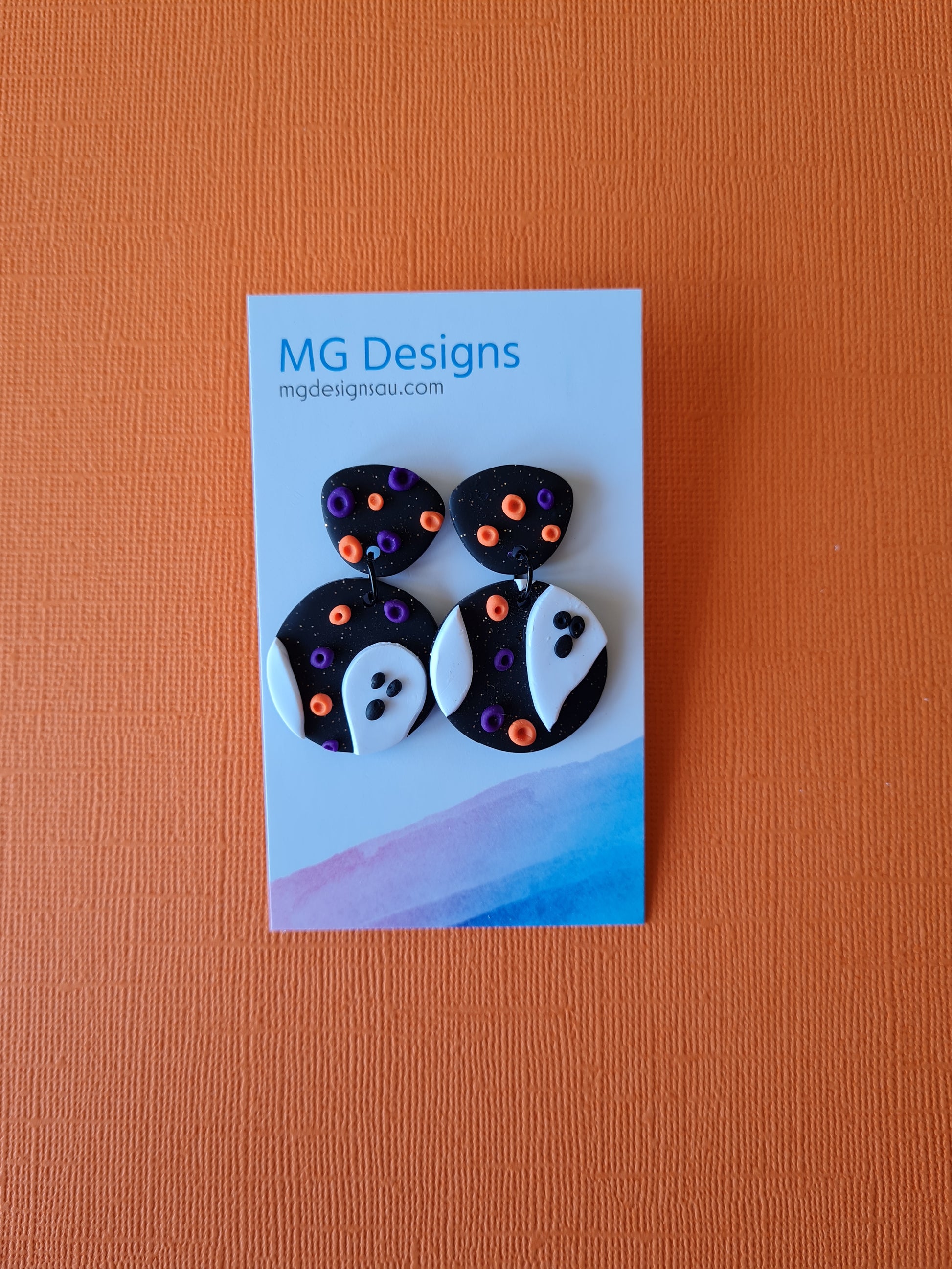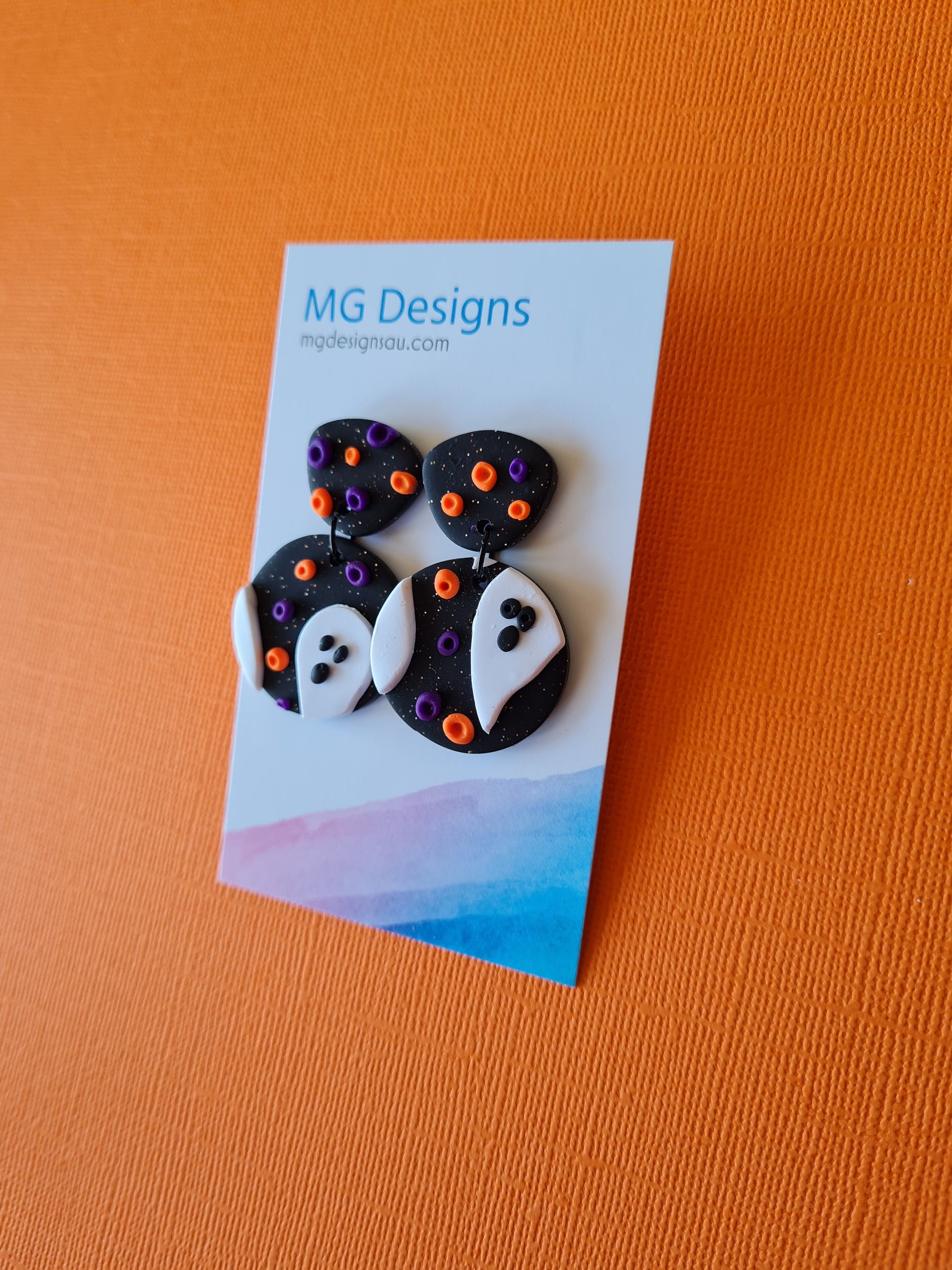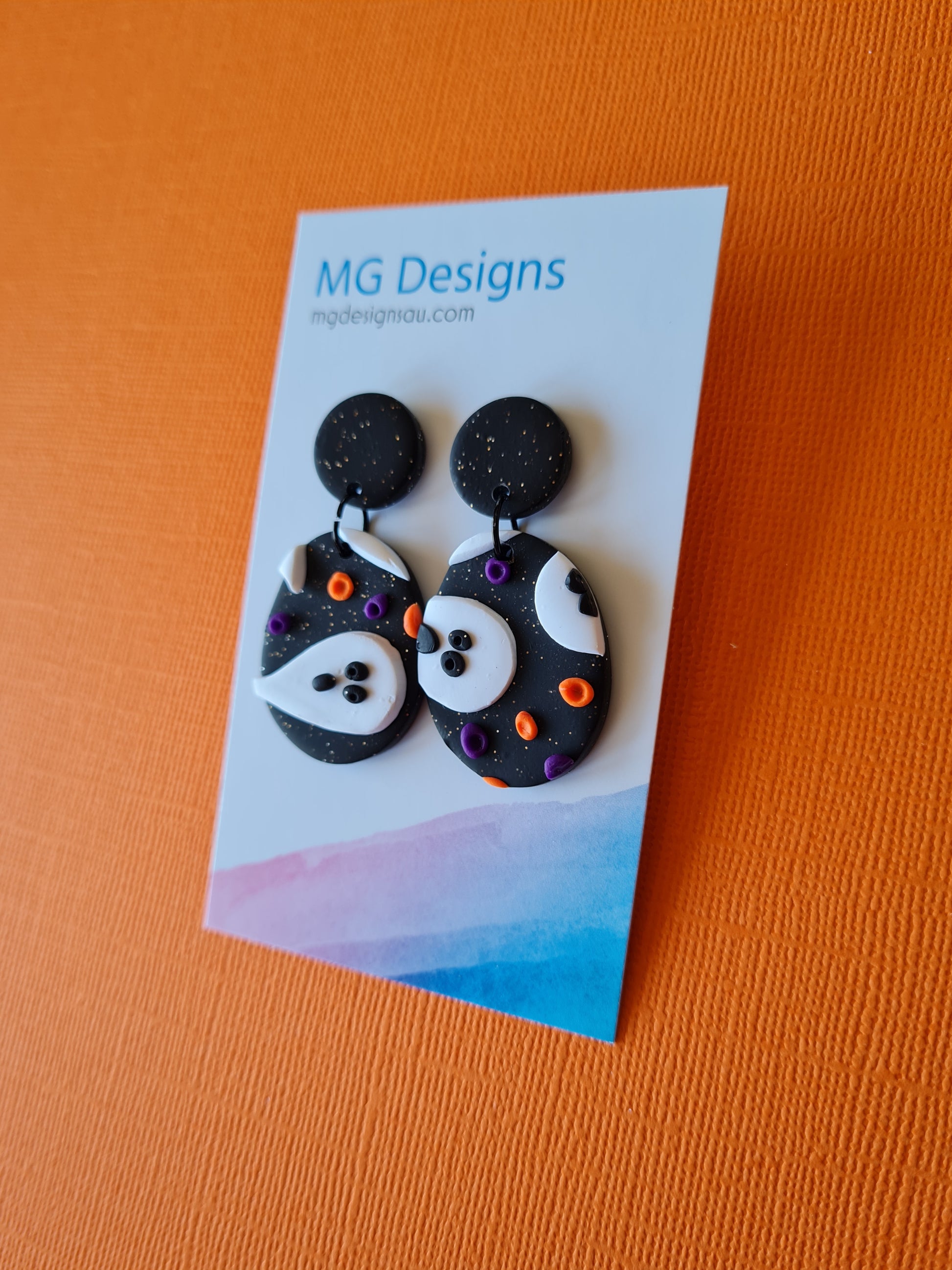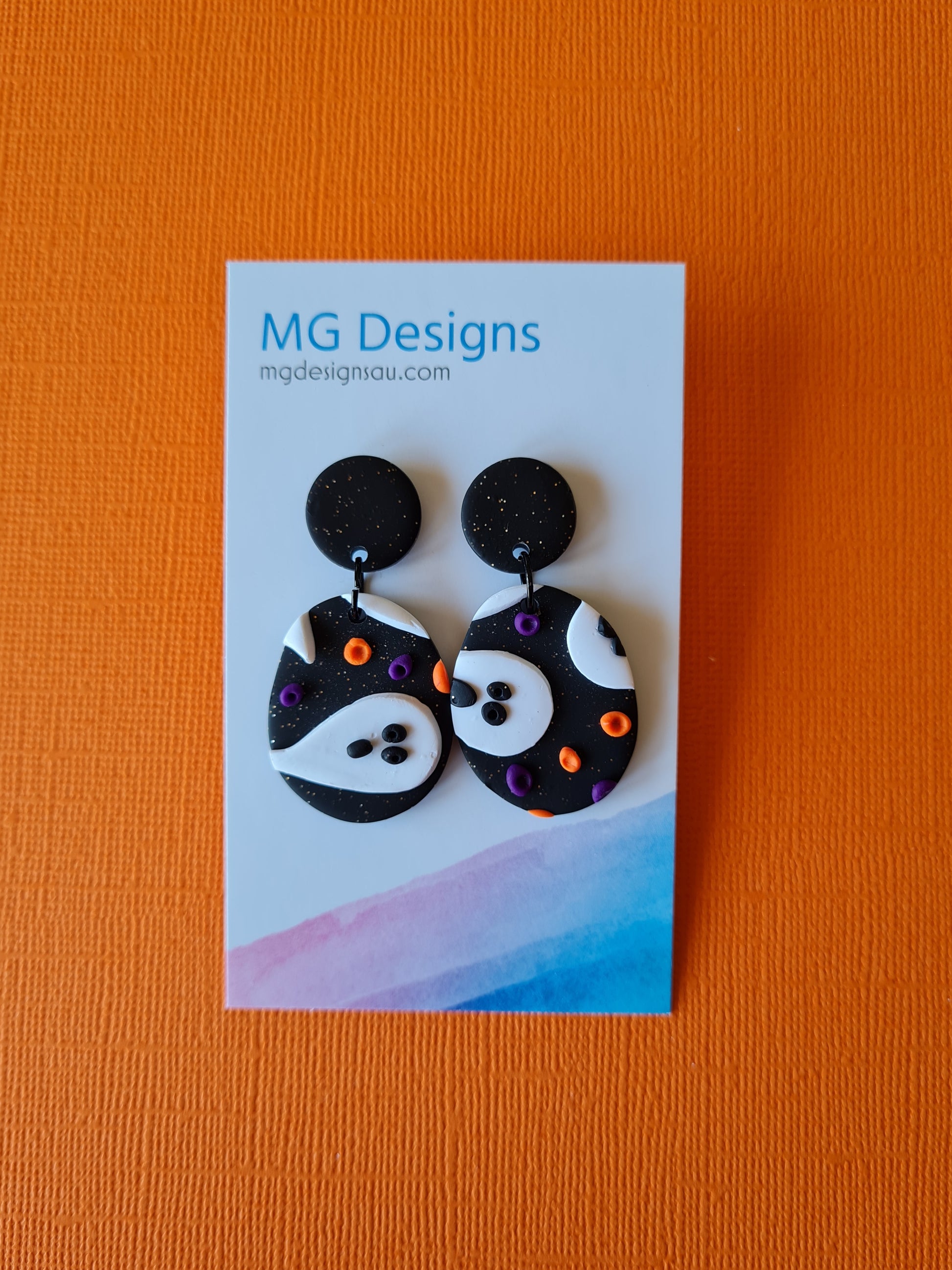 Add a little spook-tacular style to your look with this clay earring! Its sparkling black background is accented by playful ghosts and purple and orange textured pieces. Let's get ghostly!