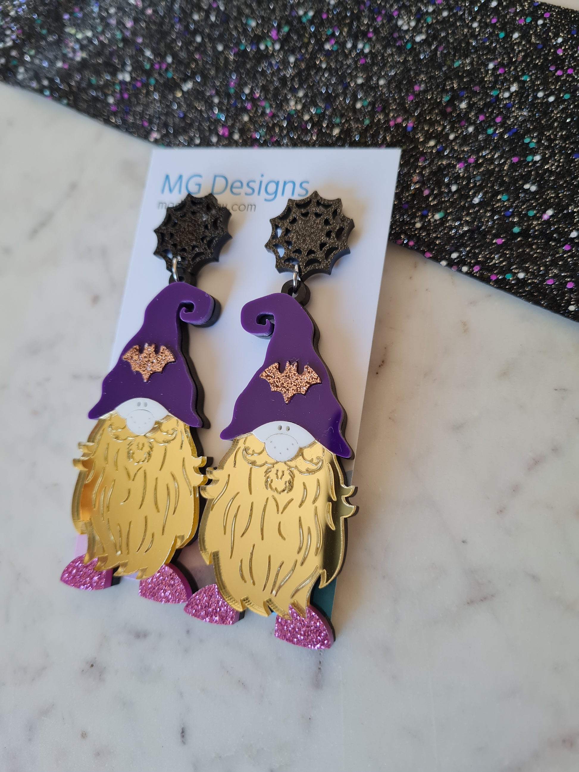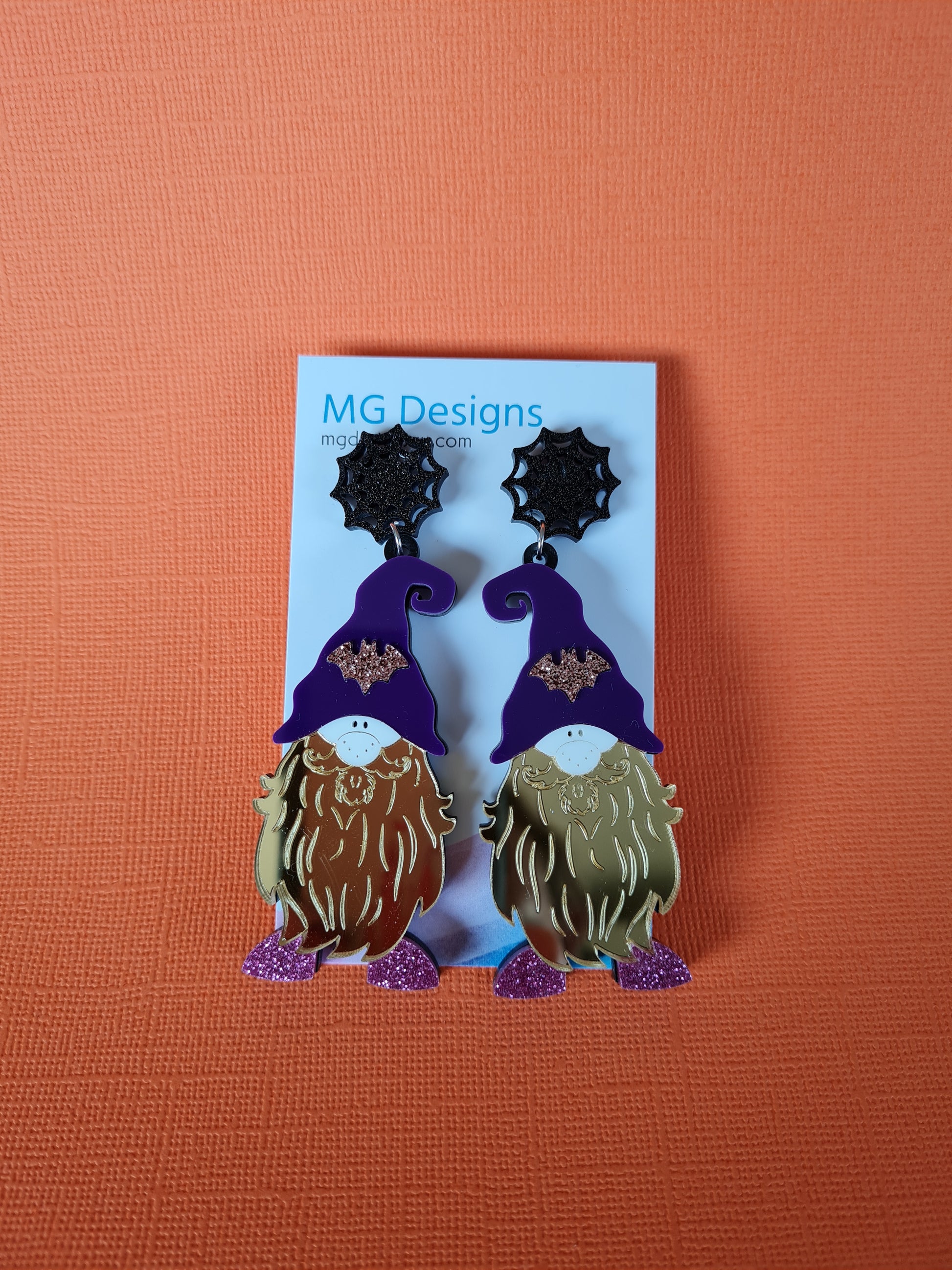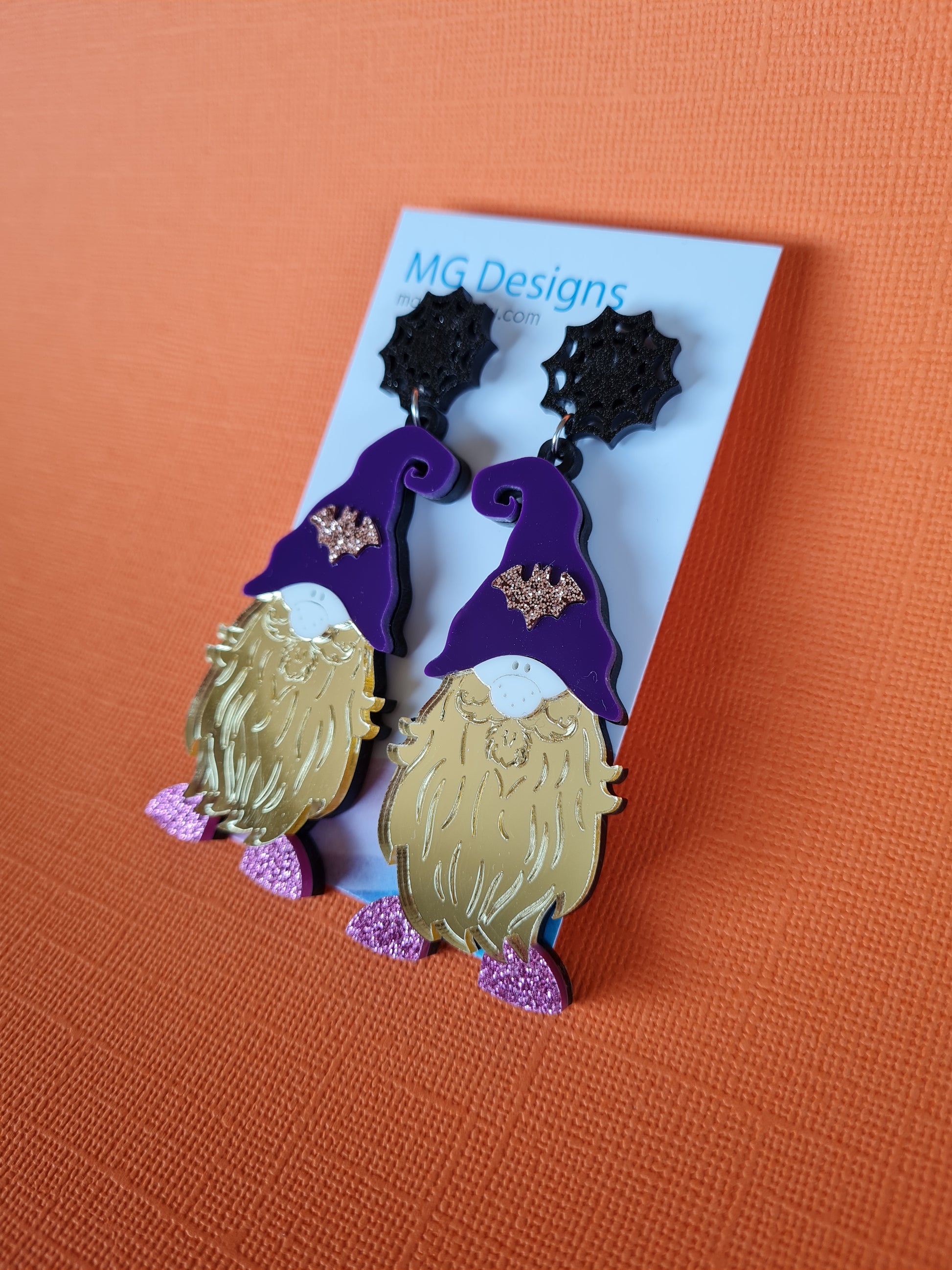 Bring a little magic into your outfit with this Spooky Gnome! He's the perfect balance of spooky but is warm-hearted. Featuring glitter and mirror acrylic that make him sparkle, and the bat featured on his hat will help him blend in with his creepy surroundings!