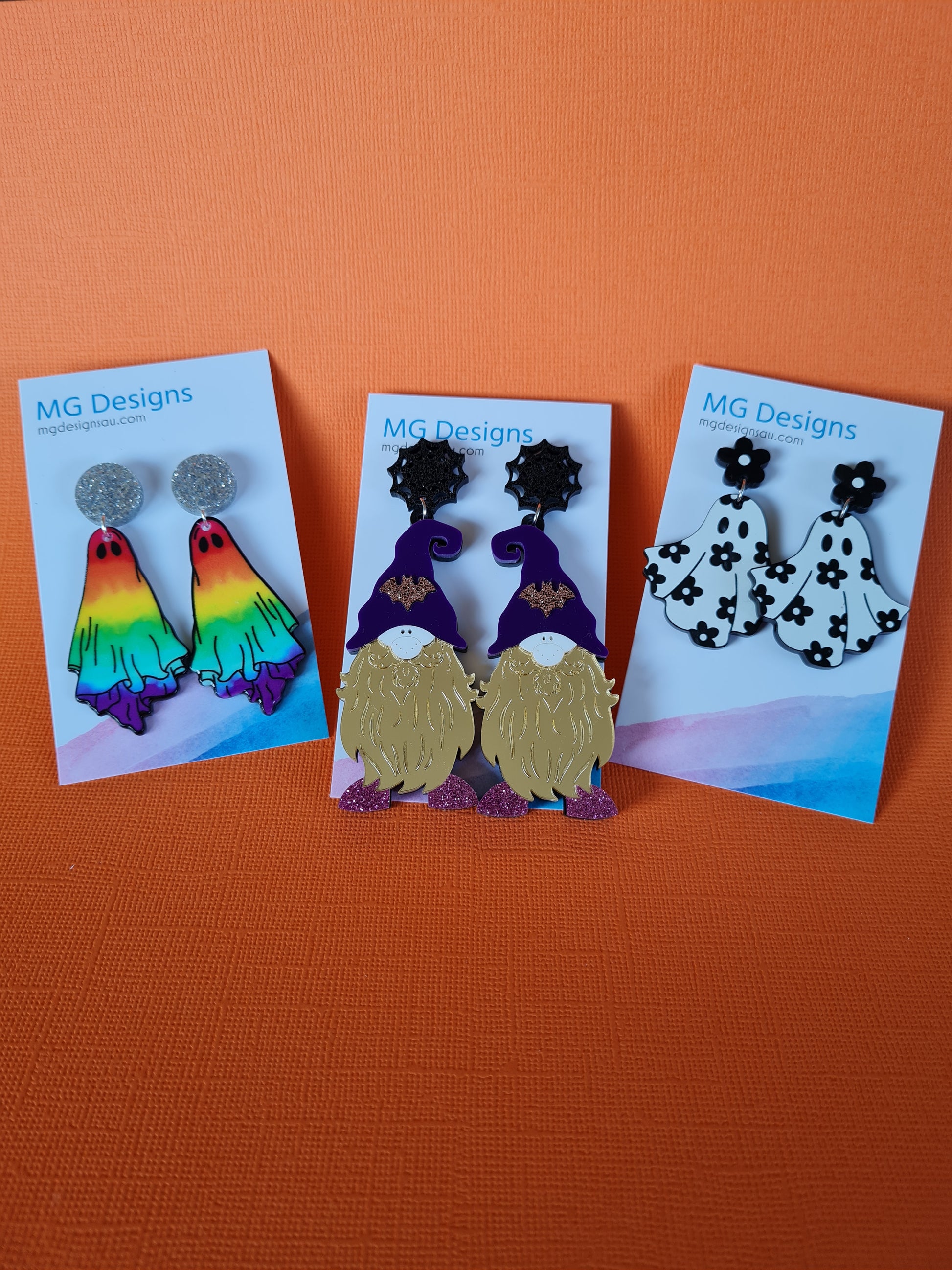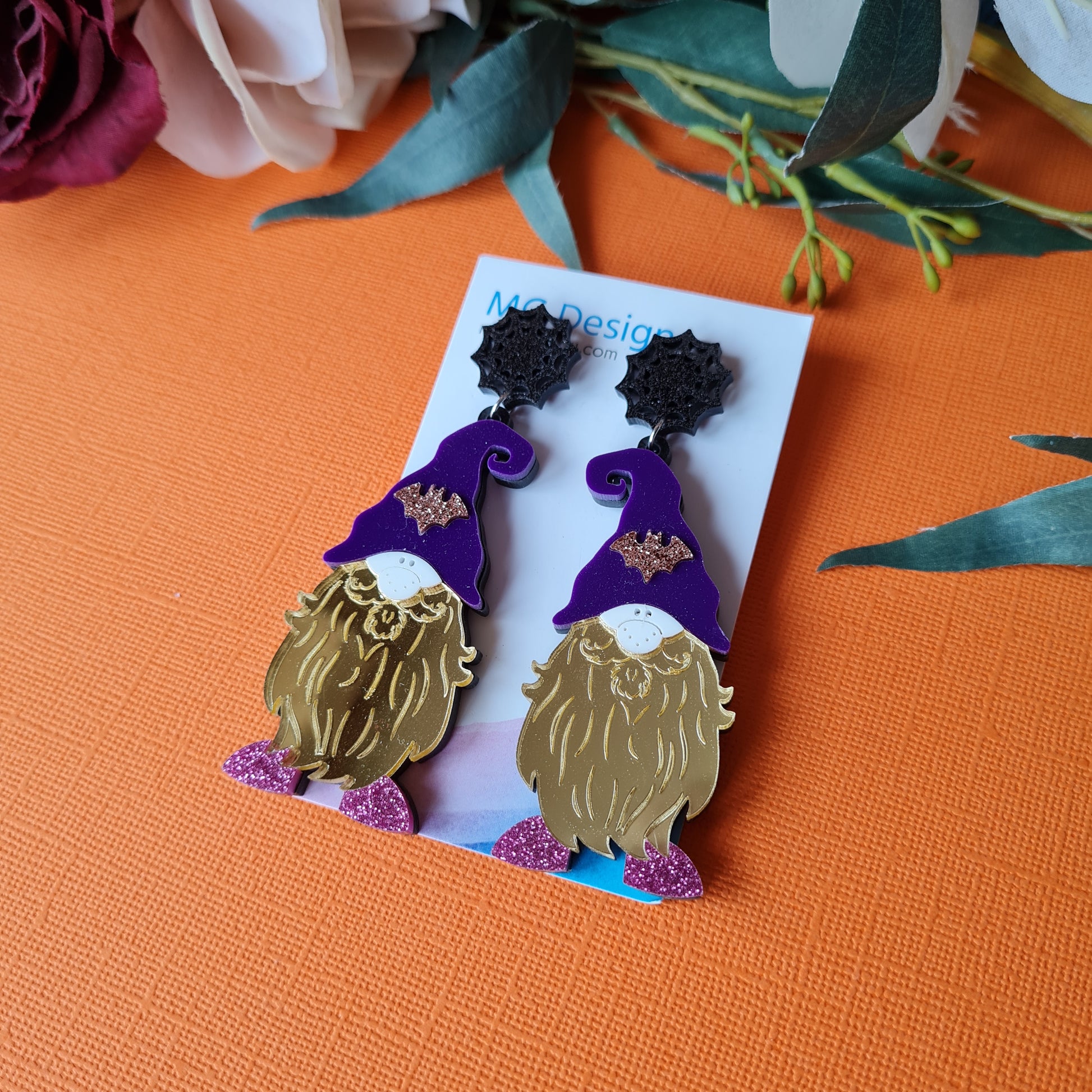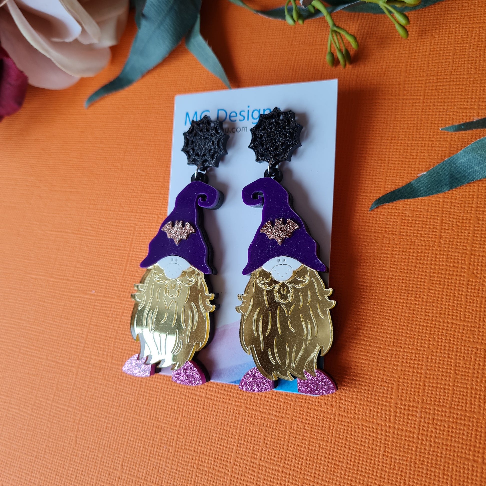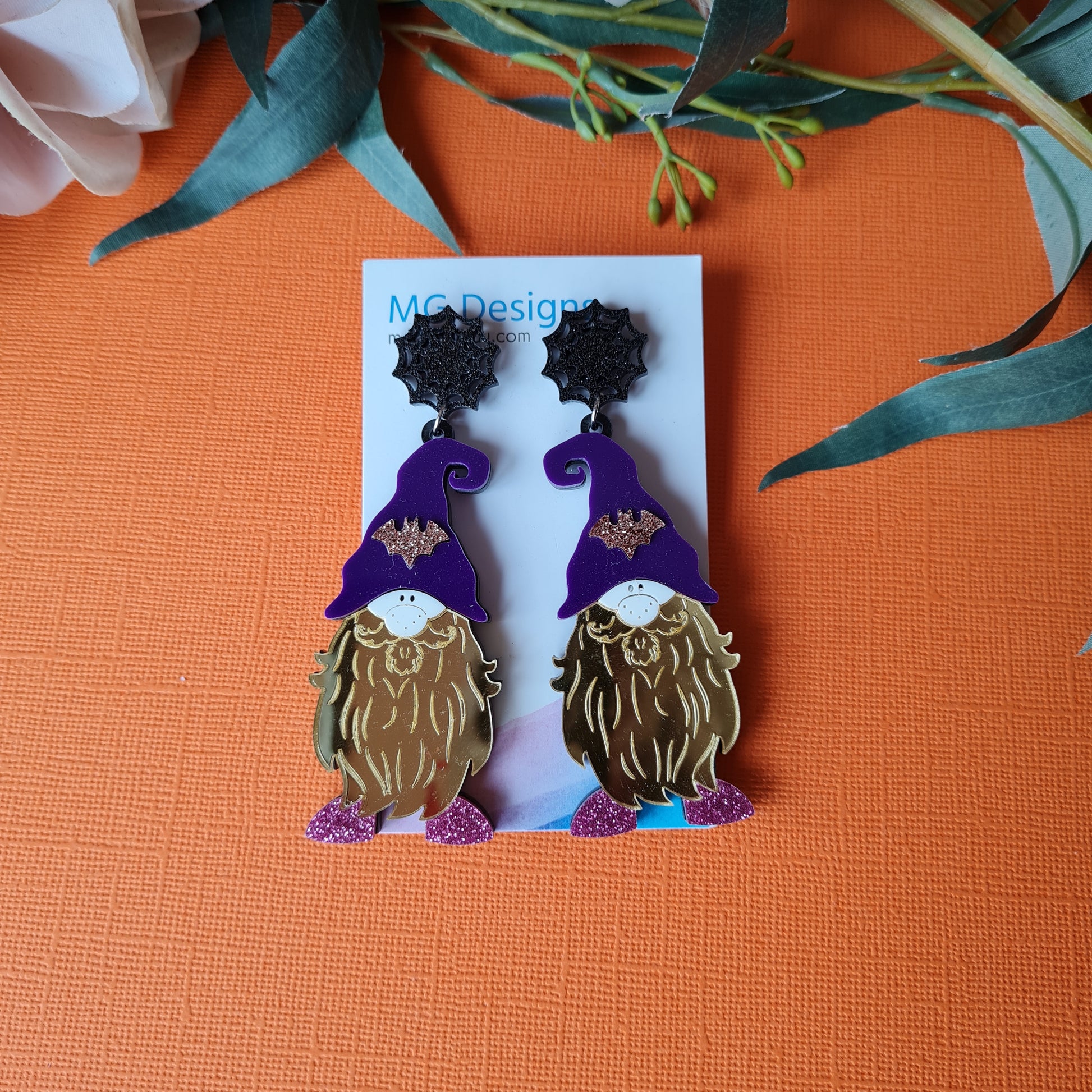 Bring a little magic into your outfit with this Spooky Gnome! He's the perfect balance of spooky but is warm-hearted. Featuring glitter and mirror acrylic that make him sparkle, and the bat featured on his hat will help him blend in with his creepy surroundings!