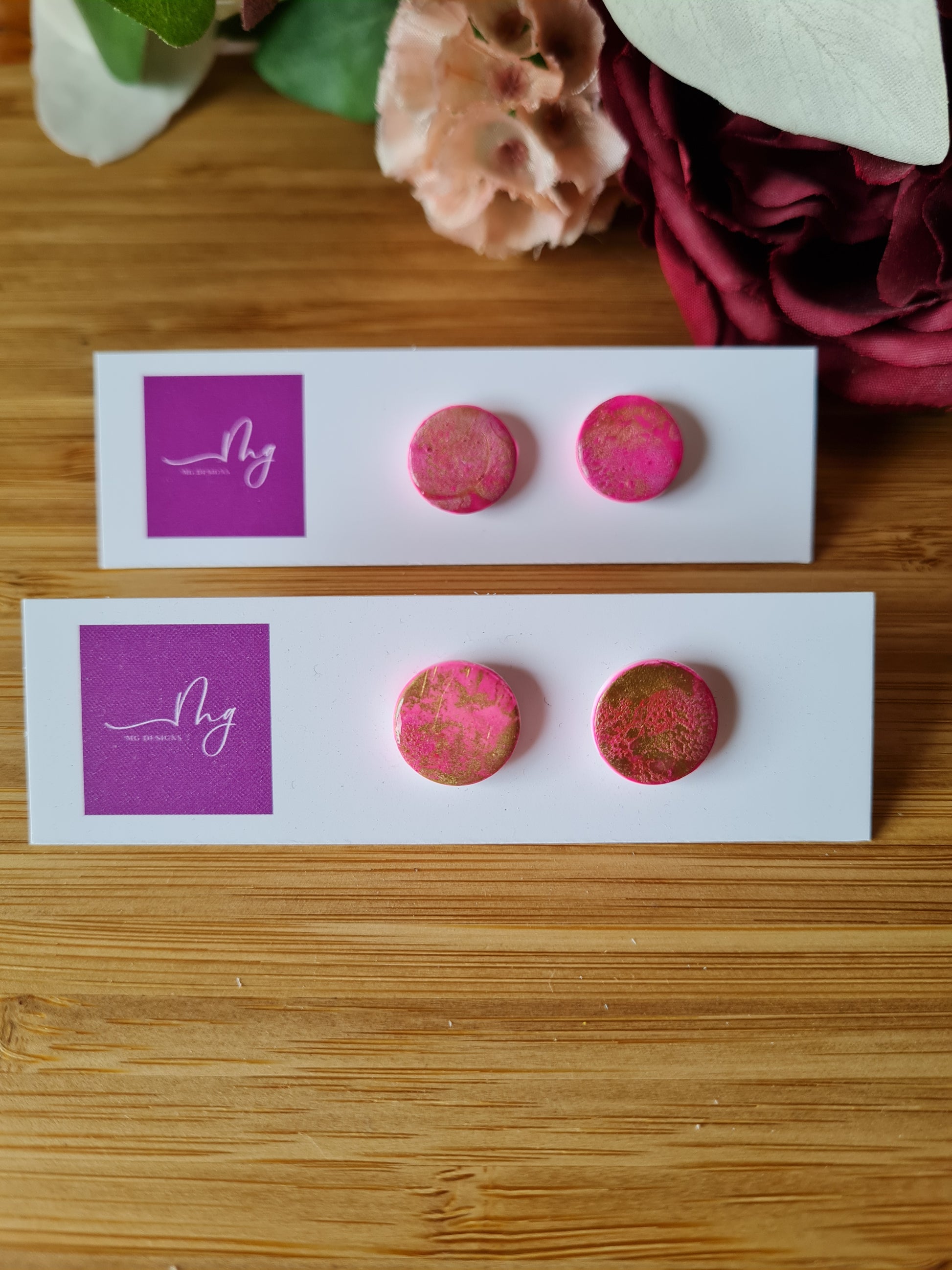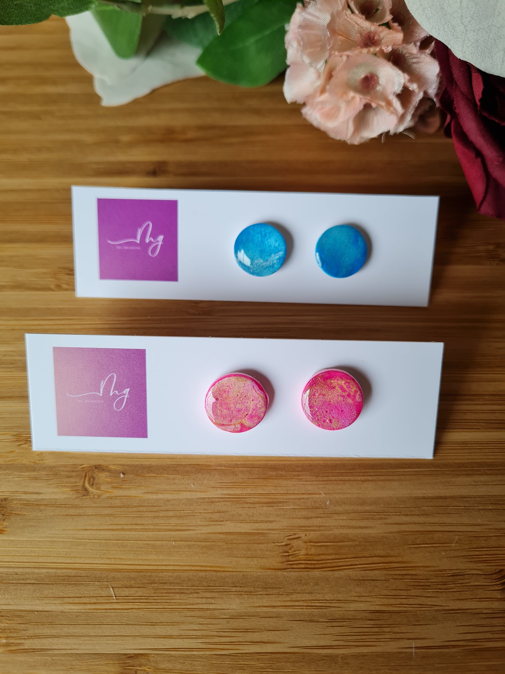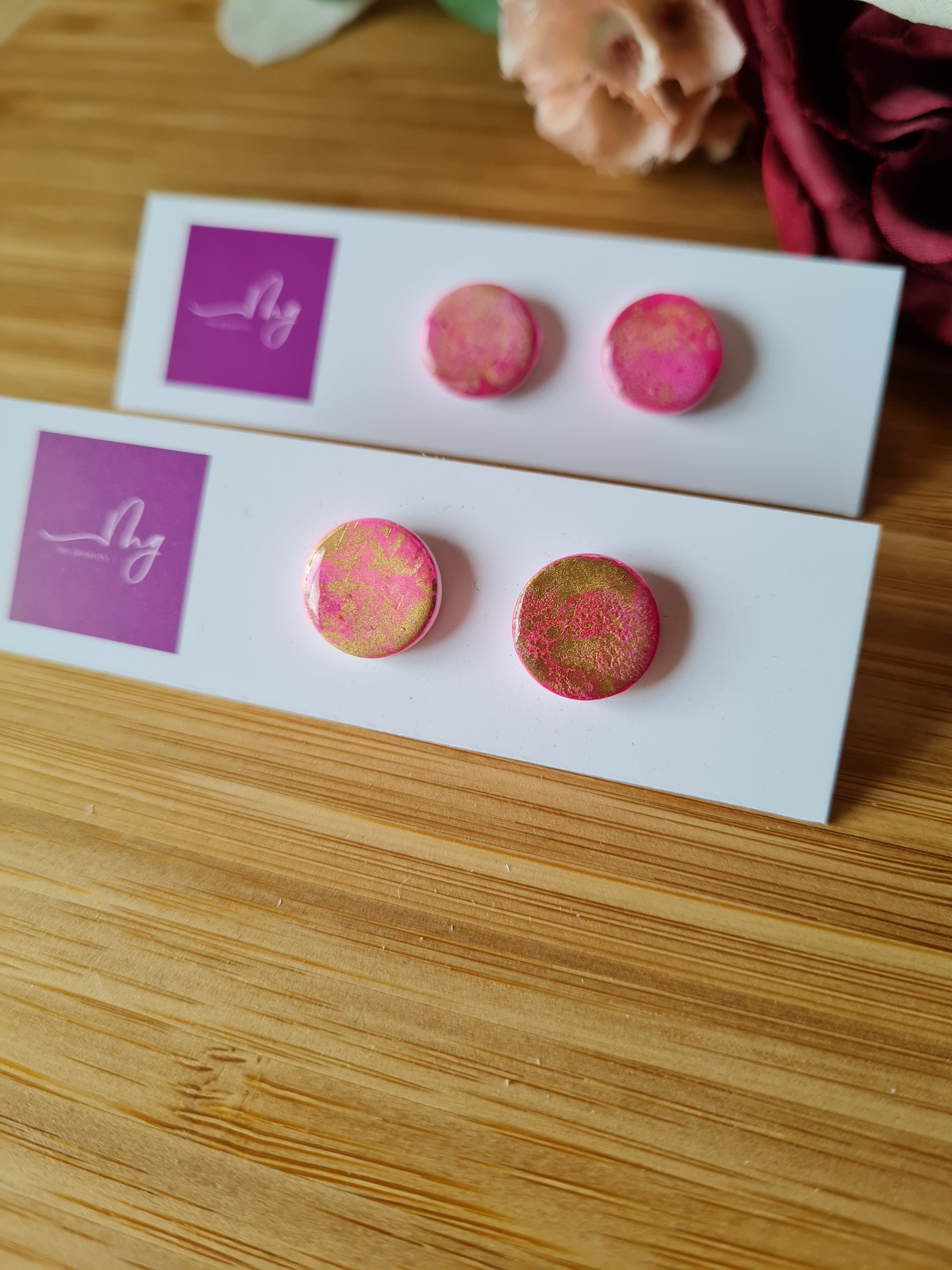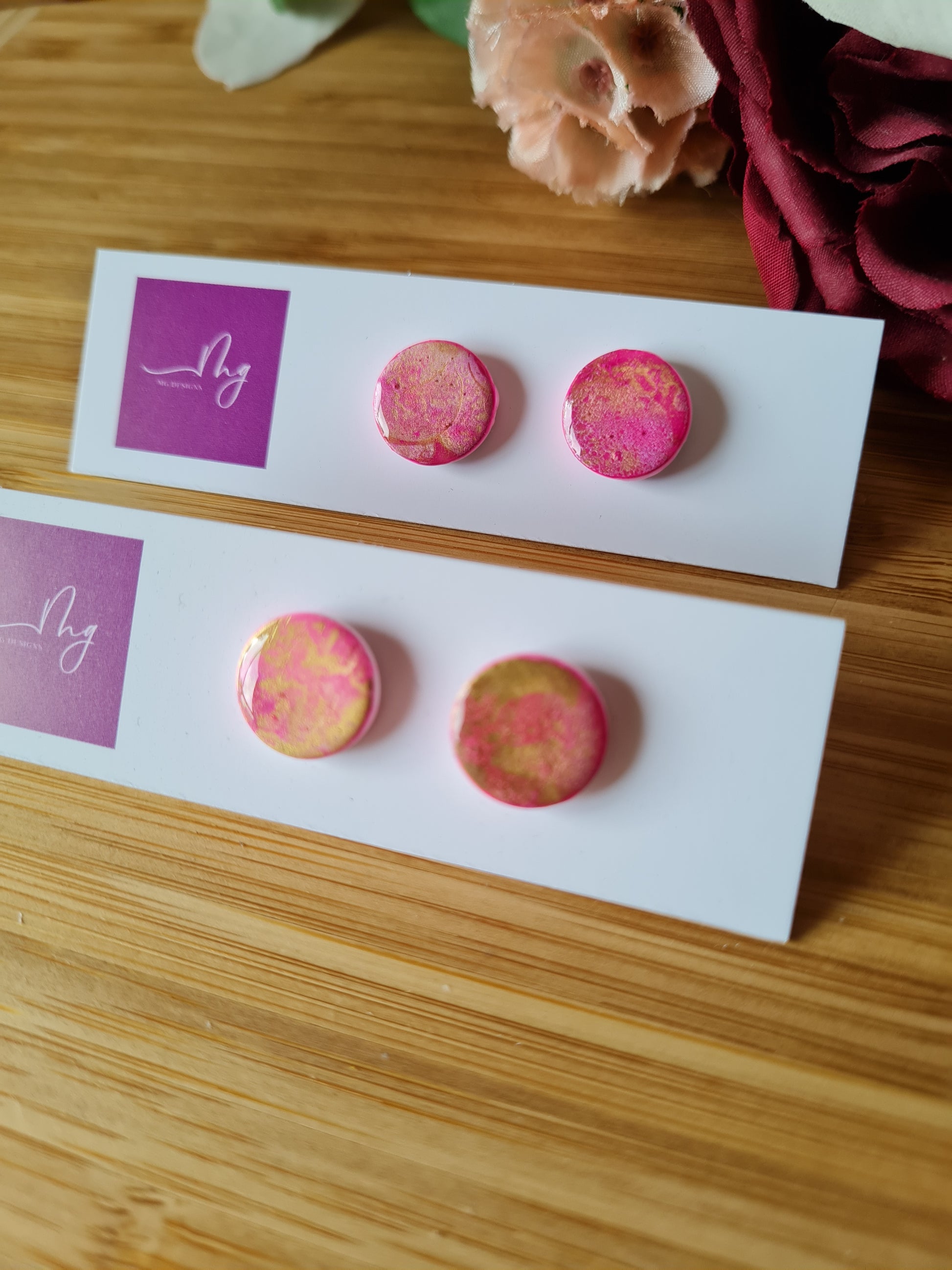 Our Tina studs are all unique in there own way. Made with gold and pink alcohol inks. Designed on polymer clay, they are hand made and cut individually, to make gorgeous pieces. These earrings come in a very limited number of shapes and are all one of a kind pieces. No two are the same. Due to being hand made, there may be some slight imperfections in the polymer clay component. Metal earring components made from stainless steel.