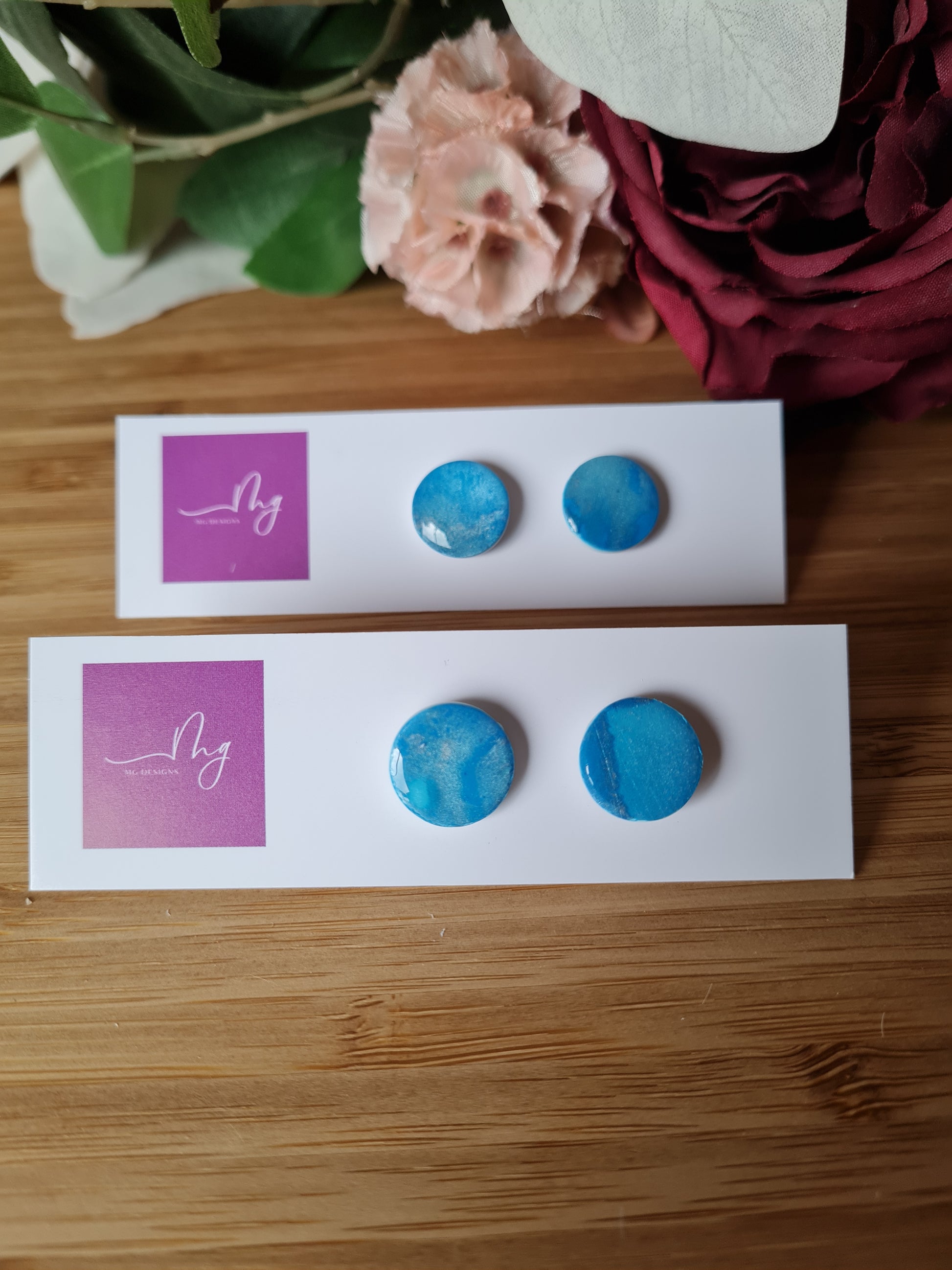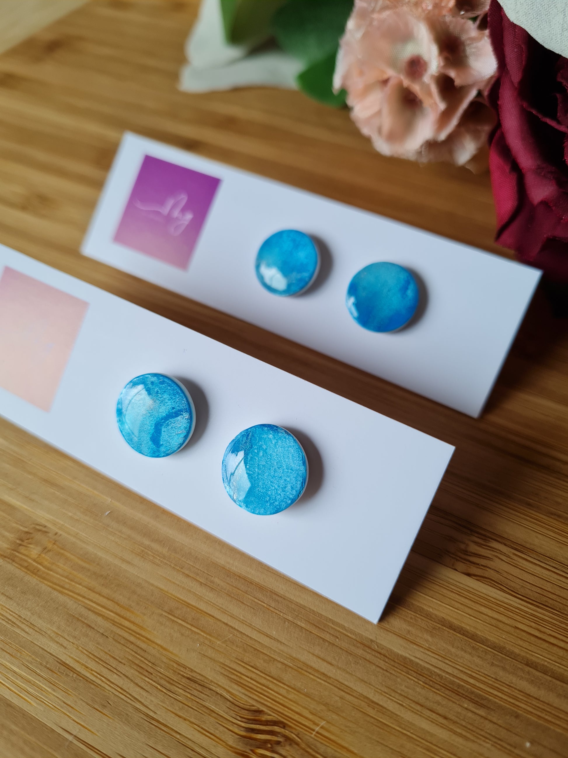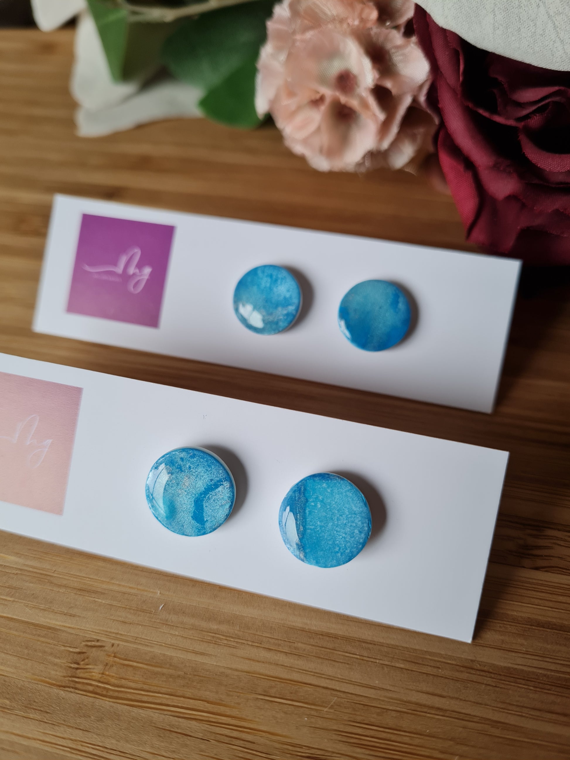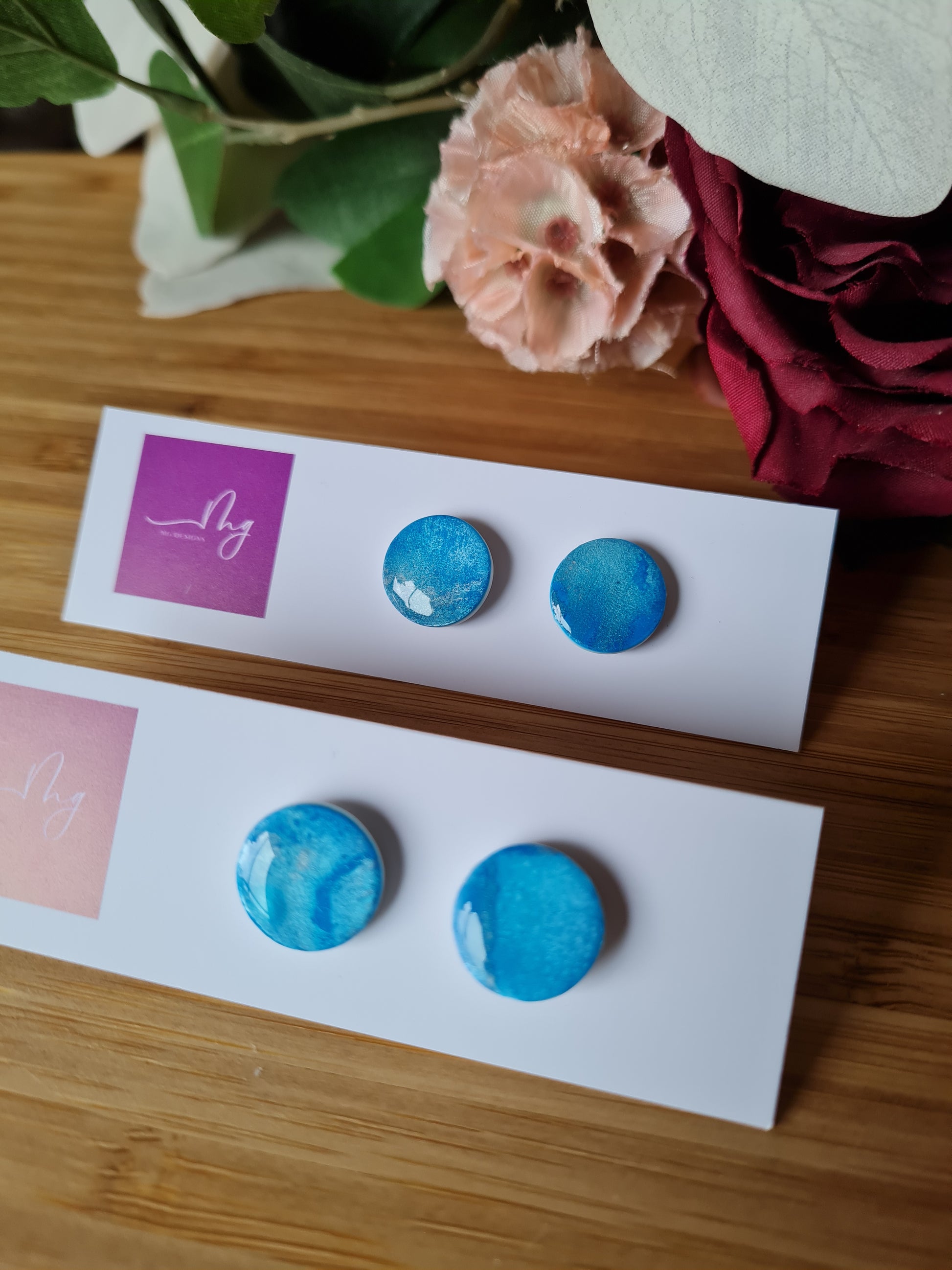 Our Tina studs are all unique in there own way. Made with silver and blue alcohol inks. Designed on polymer clay, they are hand made and cut individually, to make gorgeous pieces. These earrings come in a very limited number of shapes and are all one of a kind pieces. No two are the same. Due to being hand made, there may be some slight imperfections in the polymer clay component. Metal earring components made from stainless steel.
